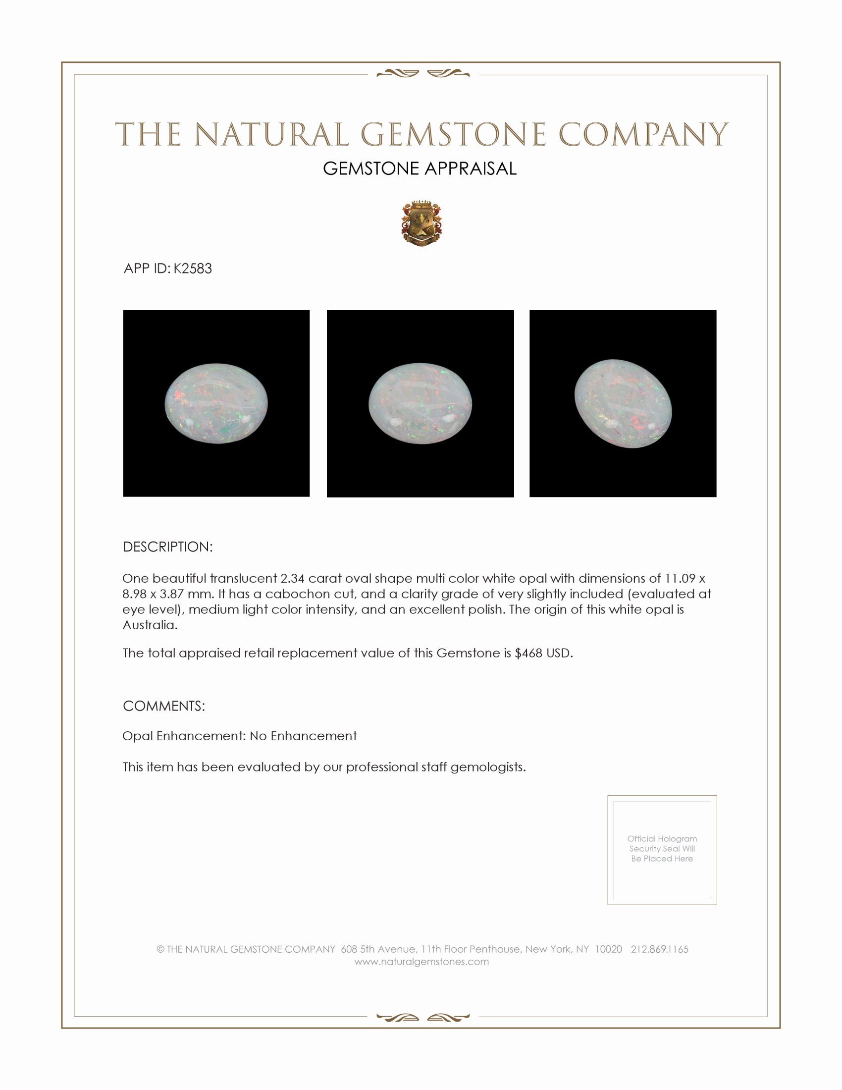 Experience the epitome of elegance and ethical sourcing with our exquisite 2.34 carat multi-color opal. The Natural Gemstone Company brings you this remarkable white opal. Sourced responsibly from the rich mines of Australia, our opal is not just a gem. It is a testament to conscious luxury and ethical craftsmanship. This oval-shaped beauty boasts dimensions of 11.09 x 8.98 x 3.87 mm and is a cabochon-cut masterpiece. This shape enhances its natural translucence and captivates with a dance of colors that articulate opulence and purity.