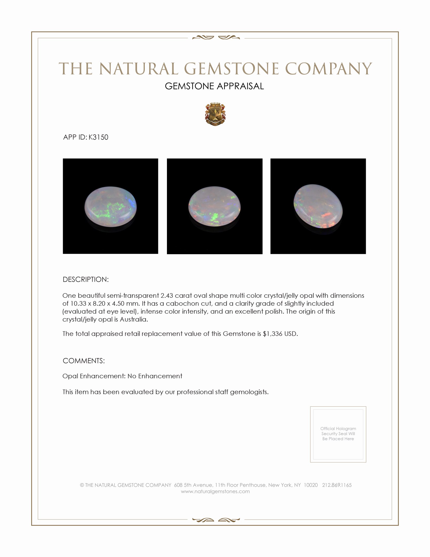 Beneath the expansive skies of Australia, nestled within its rugged terrains and rich layers of earth, the story of an extraordinary gemstone begins. Here, in one of nature’s most secretive playgrounds, a captivating wonder is nurtured slowly over ages, uniting elements of earth, water, and light into an opulent display of colors. This particular field has birthed one of nature’s undeniable masterpieces—a 2.43-carat oval Crystal Opal, whose journey from the depths of the earth to your collection embodies a vibrant saga of transformation.