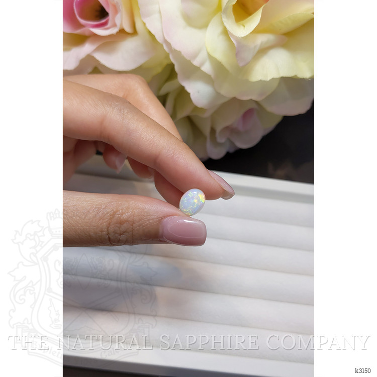 The exquisite opal, with its dimensions of 10.33 x 8.20 x 4.50 mm, was brought to the expert hands of artisans at The Natural Gemstone Company. There, it underwent a labor of love, a meticulous process to preserve its natural essence while enhancing its breathtaking appeal. The opal blossomed under their guidance, showing its true spectrum of colors with the masterful cabochon cut—a style that retained its pure, semi-transparent allure. This cutting process is as much about restraint as it is about release, showcasing the gem’s true vibrancy with an excellent polish that reflects light across the surface in spectacular fashion.