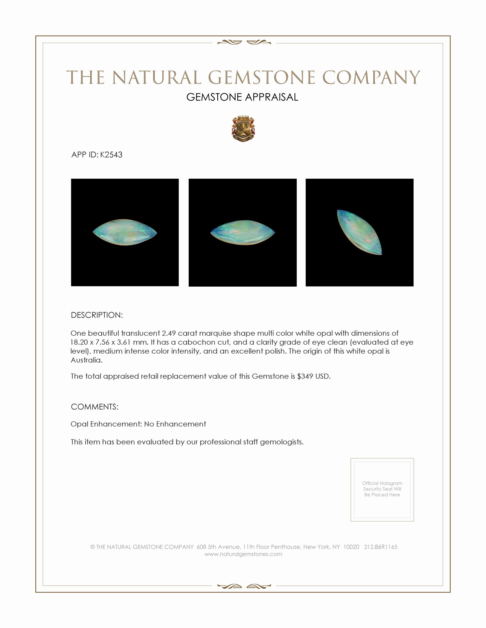 The exquisite translucent 2.49 carat marquise-shaped multi-color opal offered by The Natural Gemstone Company is a testament to both rare beauty and ethical sourcing. Measuring 18.20 x 7.56 x 3.61 mm, this opal showcases the meticulous craftsmanship that goes into curating fine gemstones for discerning collectors. As an exceptional specimen of the white opal category, this gemstone possesses a vibrant dance of colors beneath its surface which are distinctly accentuated by its medium intense color intensity. Such hues range from gentle pastels to deep, rich colors that capture the charm of the Australian landscape where it was expertly mined.