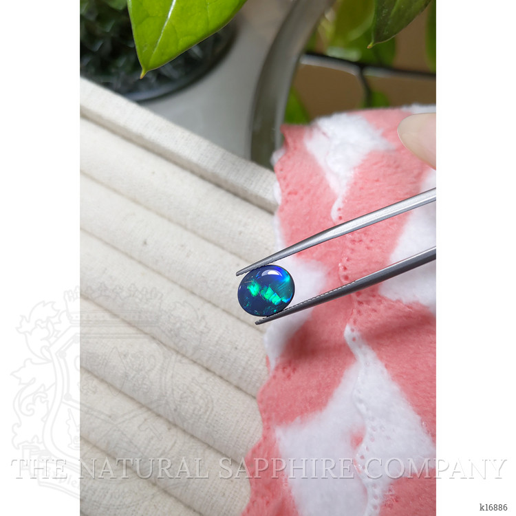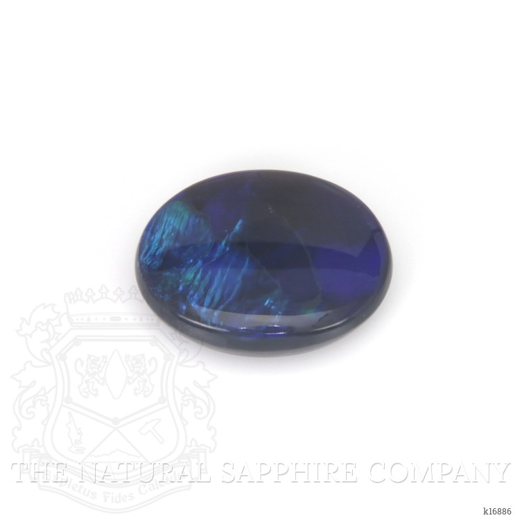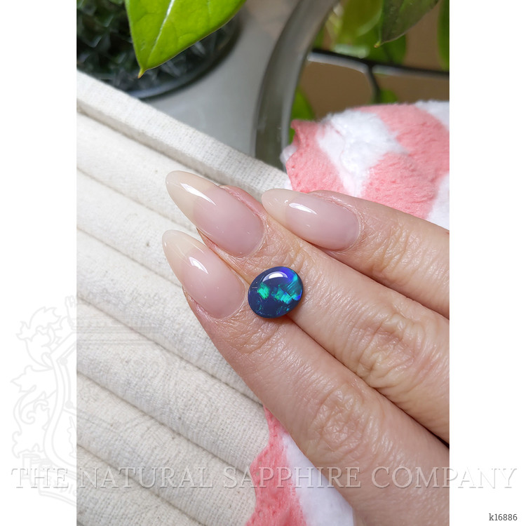 This Black Opal is a precisely characterized gem, weighing 2.49 carats, presented in an elegant oval outline, with exact dimensions of 11.36 by 9.32 by 3.85 mm. The cutting style is a tablet cut, selected to maximize the optical phenomenon characteristic of gem opal while preserving structural integrity and surface area. Clarity is graded very slightly included at eye level, indicating minute internal features that do not detract from face up appearance or play of color. Color intensity is rated intense, with a broad multi color palette visible across the tablet surface, and the stone displays an excellent polish that yields immediate luster and a crisp termination of color planes. This specimen is verified as natural, with no enhancement, and it originates from Australia, supplied and authenticated by The Natural Gemstone Company.