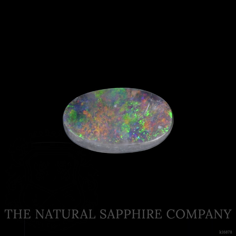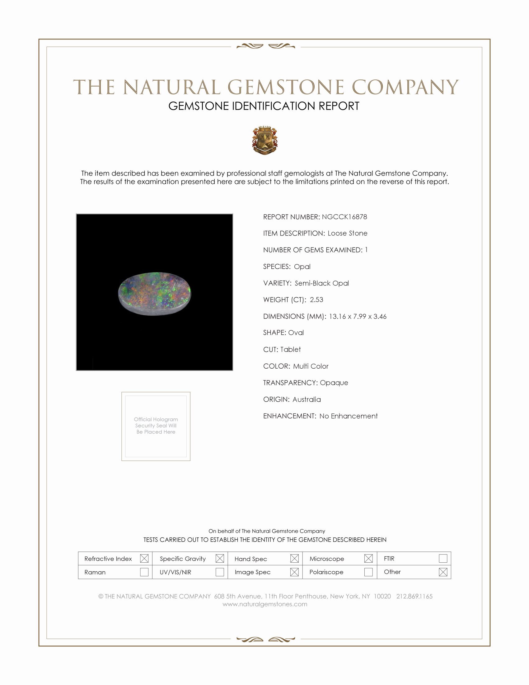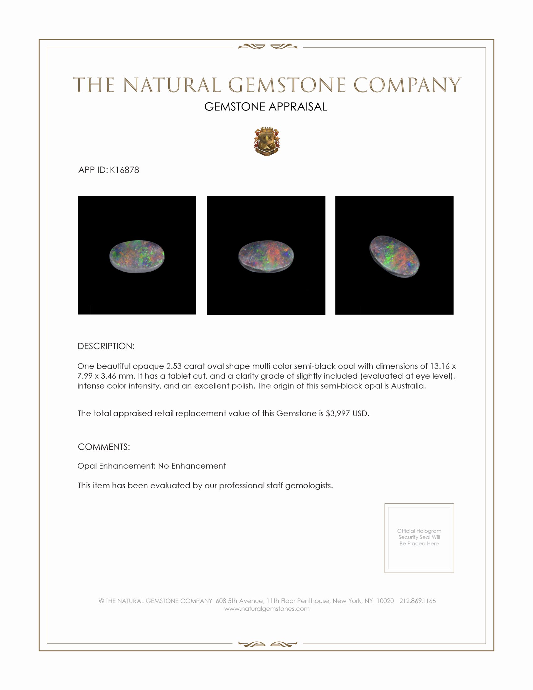 This listing describes one beautiful opaque 2.53 carat oval multi color opal, Semi-Black Opal, measuring 13.16 x 7.99 x 3.46 mm. The gem has an oval shape with a tablet cut and an excellent polish, presenting an intense color intensity across play of color in green, red, and blue tones. The clarity grade is slightly included, evaluated at eye level, and the stone has no enhancement. Origin is Australia. The tablet cut yields a relatively flat profile with a broad display surface, making this piece particularly suited to designs that emphasize face up color, while the semi black body tone provides a contrasting backdrop that enhances vivid color patches in a range of lighting conditions.