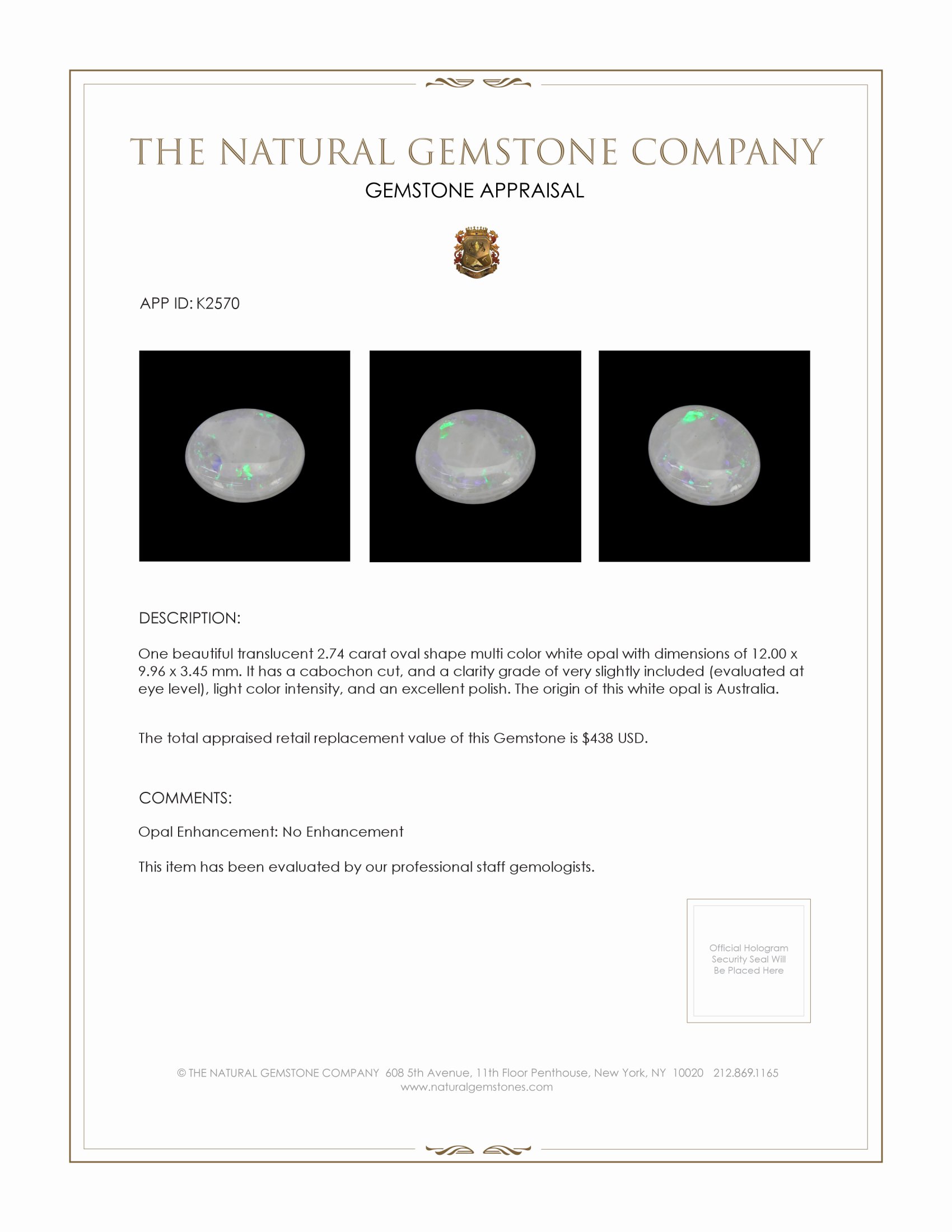 Discover the extraordinary allure of rarity and beauty with our exquisite 2.74 carat oval-shaped multi-color opal from The Natural Gemstone Company. A true marvel of nature, this remarkable gemstone presents an unparalleled opportunity for those in search of the perfect piece to complete their high-end collection or to mark a special moment with unparalleled grace. The quest for an engagement ring that reflects a love as unique as yours or the endeavor to find a gemstone that stands out among the rest ends here with this opal.