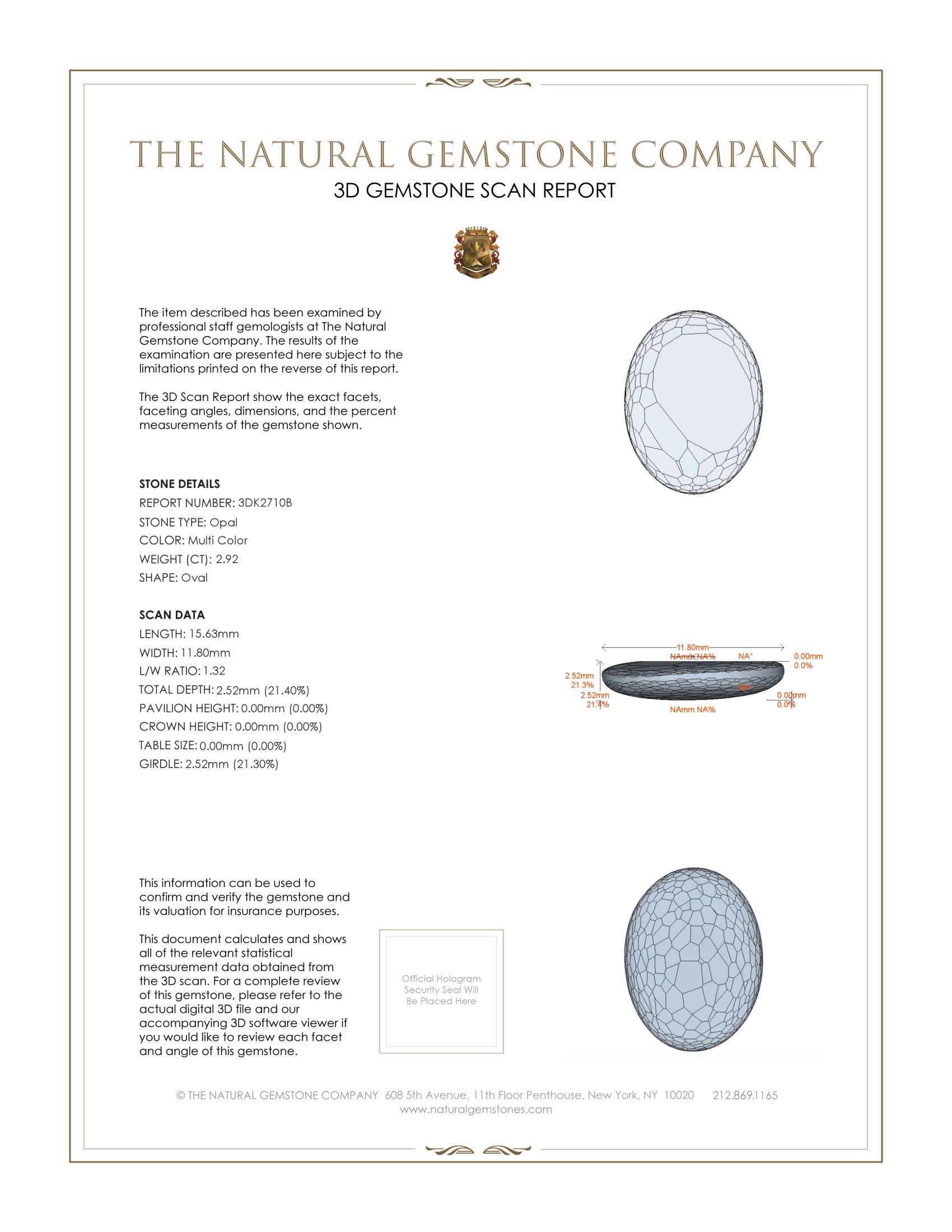 Hidden within the heart of the Earth's crust, forged by time and nature, lies a treasure so extraordinary that only a select few will ever have the privilege to call it their own. Presenting an exquisite 2.92 carat oval-shaped opal—a gem that is as rare as it is beautiful. This opal, with its dimensions of 15.63 x 11.80 x 2.52 mm, is not just any stone. It is a piece of history, a geological marvel that has traveled through millions of years to grace the present with its presence. The opal's rich, multi-colored palette is a dance of colors captured beneath the earth's surface millions of years ago, making each one a unique fingerprint born of fire and water. Here at The Natural Gemstone Company, we are honored to offer such an exceptional treasure, a piece that assures you a place in the company of connoisseurs across the globe.