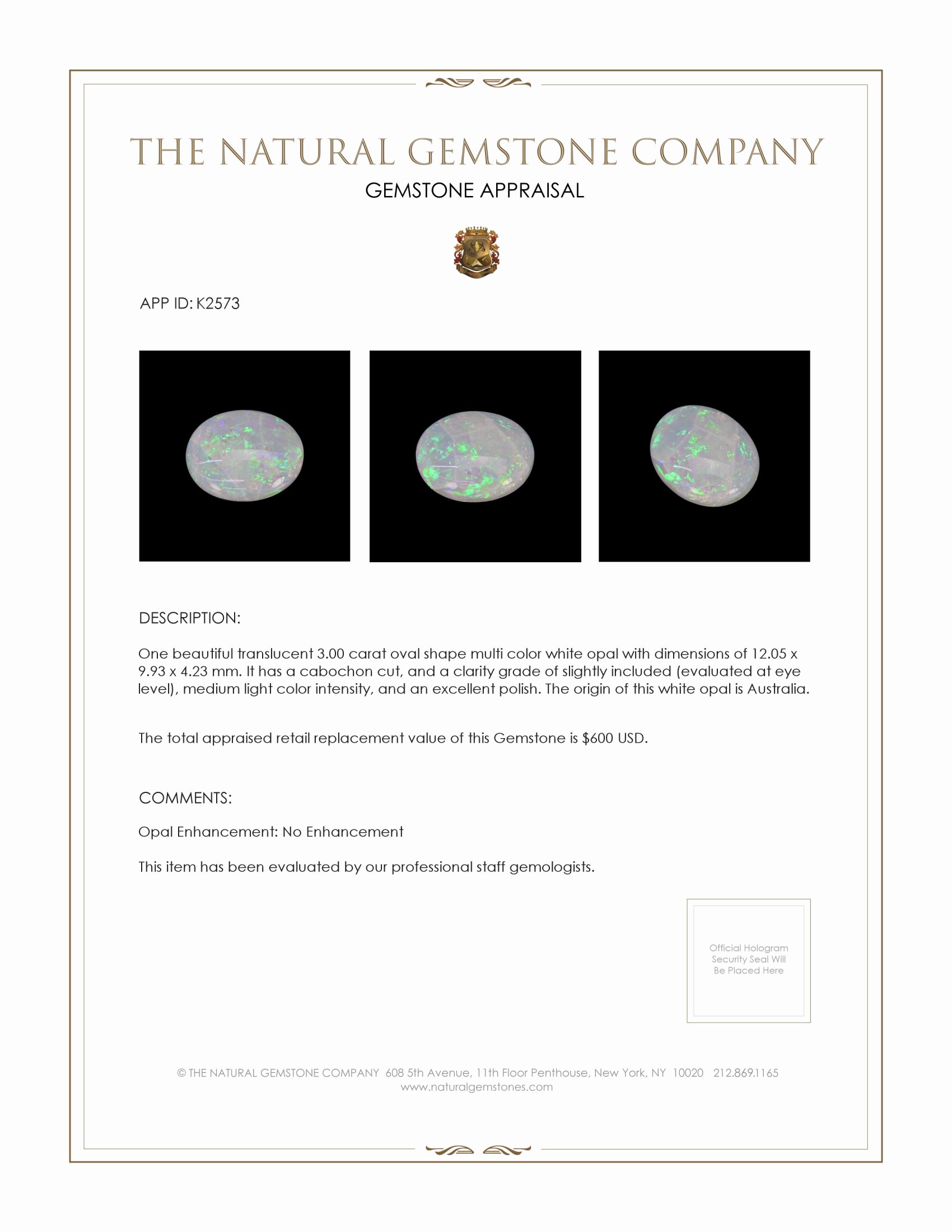 Introducing a truly extraordinary gemstone, a treasure for the discerning collector and aficionado of the world's most exquisite materials. This striking 3.00-carat multi-color opal, with its elegant oval shape, presents an unparalleled opportunity to own a piece of nature's artistry. With dimensions of 12.05 x 9.93 x 4.23 mm, this opal boasts a stature that is both commanding and sophisticated. Suitable for the most refined bespoke creations, this gem stands as a testament to the beauty and magical allure that only nature can offer.