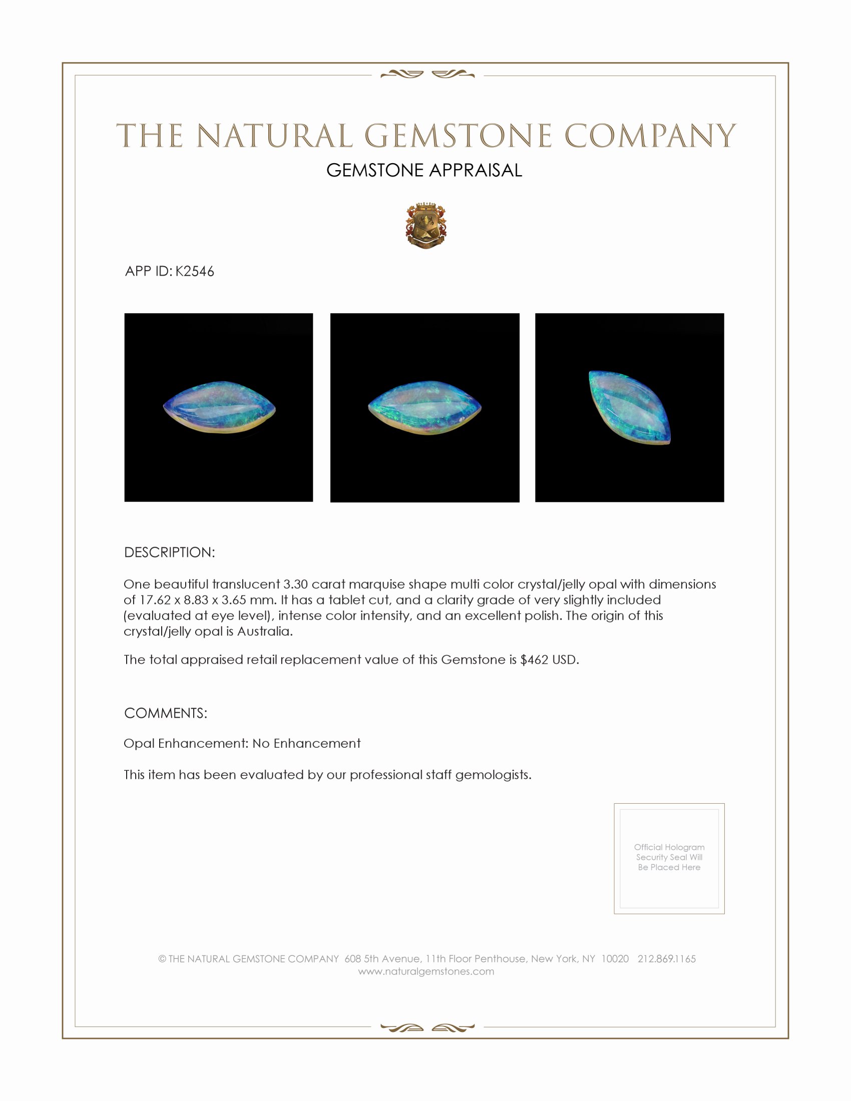 In the vast and ancient landscapes of Australia, where the earth holds secrets as old as time itself, there begins a journey that transforms raw elements into objects of radiant beauty. From these sacred grounds, our 3.30-carat marquise-shaped multi-color opal emerges, destined to captivate and enchant. This extraordinary gemstone, with its translucent allure and unique splendor, captures the essence of nature's timeless artistry.