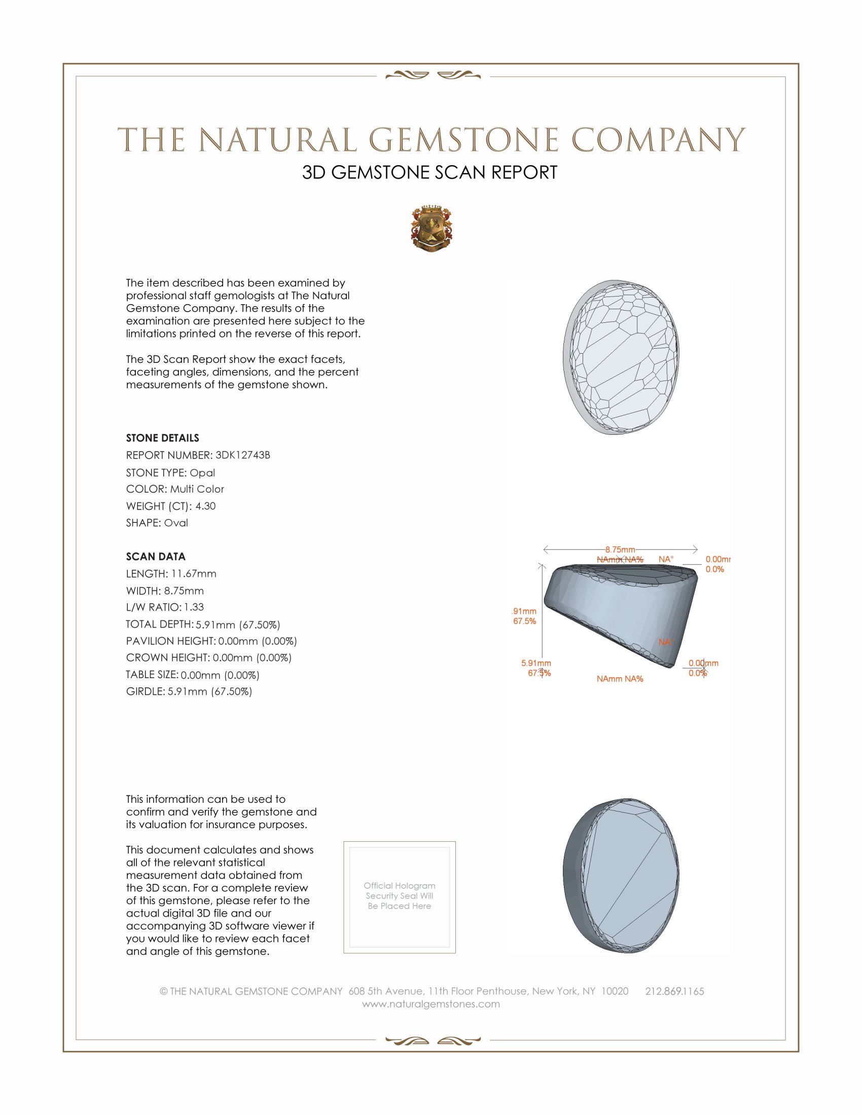 In the world of rare treasures, where beauty and craftsmanship unite, lies a captivating masterpiece that promises to leave you breathless—a 4.30 carat oval-shaped multi-color opal, lovingly crafted by the earth in the enchanting landscapes of Australia. This gemstone, meticulously sculpted with a precise tablet cut, embodies an intense color intensity that radiates with every shift of light, captivating the imagination and stirring emotions you never knew lay dormant. It hearkens back to the magic of nature's artistry, whispering tales of a timeless connection between the earth and its precious creation.