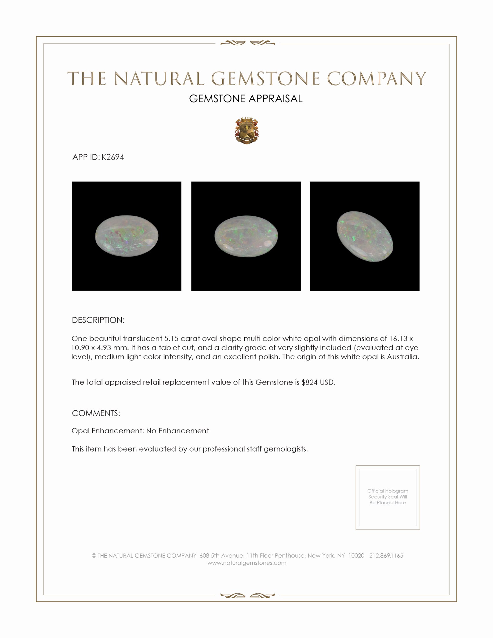 Introducing a truly magnificent gemstone that transcends the ordinary, presenting the 5.15-carat oval-shaped multi-color opal from The Natural Gemstone Company. This exquisite piece, originating from the rich fields of Australia, embodies the delicate interplay of nature's artistry and human craftsmanship. It is a type of white opal, known for its entrancing display of vivid spectral colors, ranging from hues of soft pastel to fiery tints that cascade across its translucent surface. With dimensions of 16.13 mm by 10.90 mm by 4.93 mm, this opal makes a substantial presence, yet its grace cannot be understated.