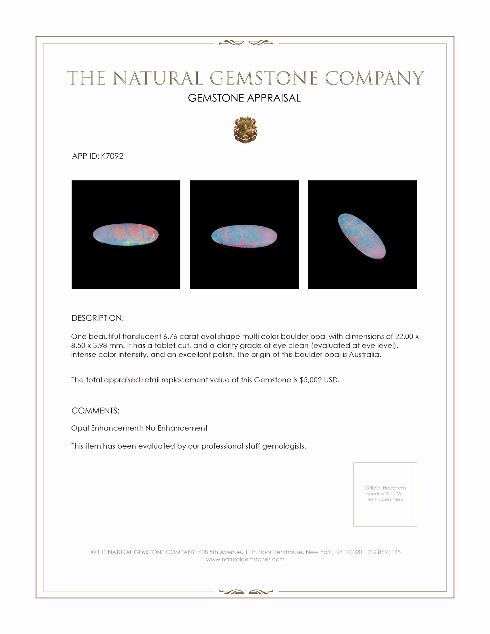 Discover the ineffable allure of a truly magnificent creation from nature's artistry, presented with unparalleled grace by The Natural Gemstone Company. Behold the exquisite 6.76-carat boulder opal, its craftsmanship reflecting an eternal dance of colors that ebbs and flows within its opalescent heart. Carefully sculpted into an elegant oval shape, with dimensions of 22.00 x 8.50 x 3.98 mm, this opal is a tribute to refined beauty, an architect of dreams that stands as a testament to the virtues of patience and sublimity.