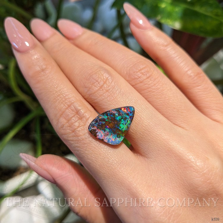 The distinct freeform shape of this opal adds a unique flair, offering limitless possibilities for bespoke jewelry. It grants the designer a wide latitude to exercise creativity, allowing for the crafting of jewelry that is as unique as its wearer. Whether it transforms into a captivating pendant that graces the neckline or an unforgettable statement ring that adorns the hand, this Boulder Opal effortlessly becomes the centerpiece of any jewelry collection. Despite its very slightly included clarity—as assessed at eye level—this opal whispers of nature’s perfect imperfections, enhancing its authentic appeal while retaining its overall vibrancy and luster.