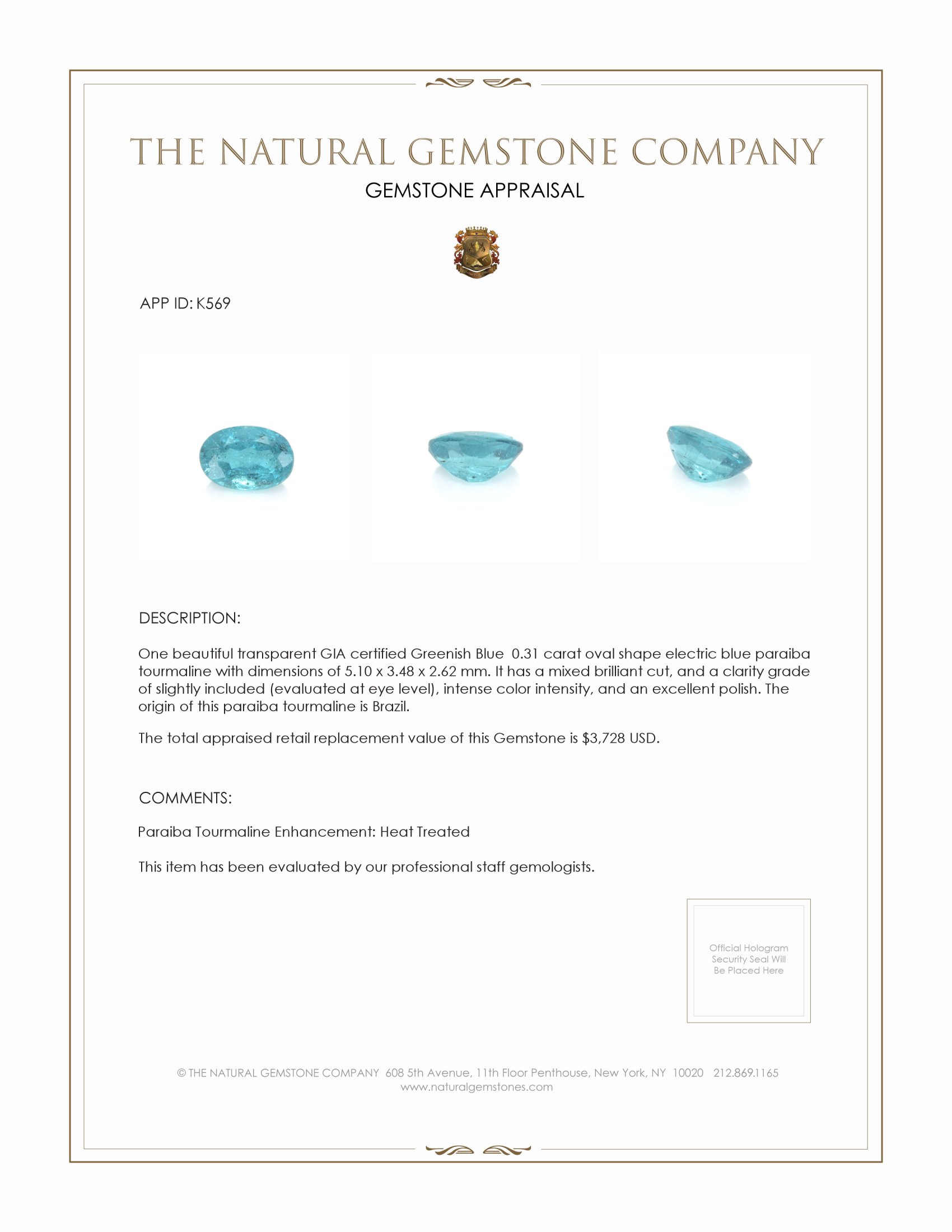 Introducing an exquisite piece embodied in a remarkable balance of strength and beauty, the stunning blue hues of our Paraiba tourmaline reflect the boundless skies and clear waters of the world. This 0.31-carat gemstone, with its impressive dimensions of 5.10 by 3.48 by 2.62 millimeters, captures the essence of resilience and charm. Certified by the GIA for its exceptional attributes, this electric blue gem invites you into a world where every day can glow with the magic of its intense color.