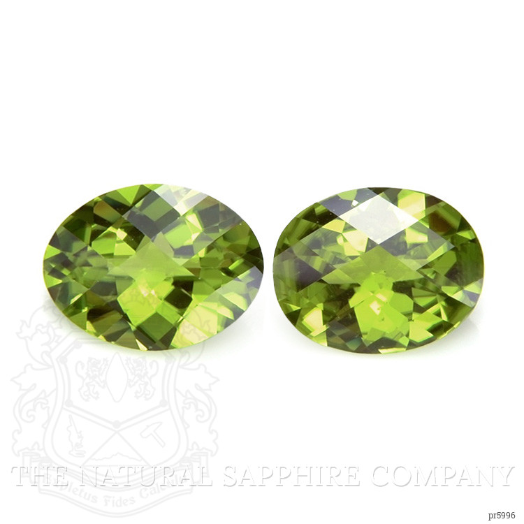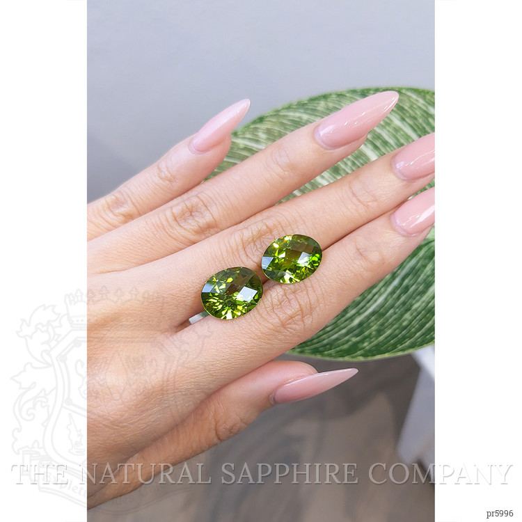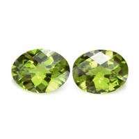 The beautiful, transparent pair of peridots are 7.88 carats and 8.12 carats respectively. They are oval shape green peridots, with the dimensions of 15.88 x 11.95 x 6.90 mm and 15.15 x 11.94 x 7.15 mm and are checkerboard cut, have a clarity grade of very slightly included (evaluated at eye level), intense color intensity, and an excellent polish. The origin of this pair of peridots is Pakistan.