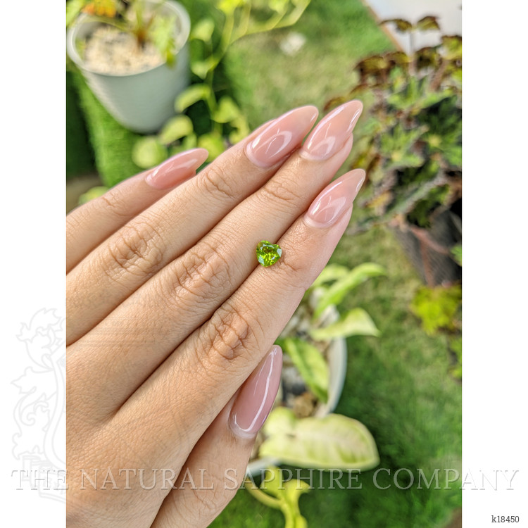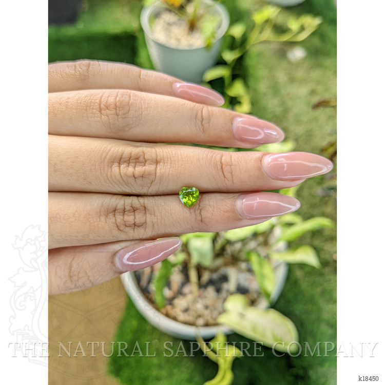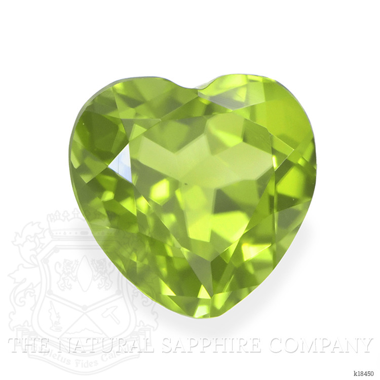 This transparent 0.95 carat heart shape peridot presents a precise combination of size and symmetry, with dimensions 5.86, 5.99, 3.92 mm. The stone is fashioned with a mixed brilliant cut, delivering controlled dispersion and focused scintillation across the heart outline. Clarity has been evaluated at eye level as very very slightly included, with inclusions that do not detract from face up appearance. Color intensity is described as intense, with a yellowish green hue that reads fresh and lively under standard daylight and jewelry lighting. Polish has been graded as excellent, contributing to crisp facet junctions and bright reflections. There has been no enhancement to alter color or clarity, and the origin is Pakistan, a source known for producing peridot with saturated, vivid tones. The Natural Gemstone Company offers this specimen as an authenticated natural peridot, with full disclosure regarding origin and treatment status.