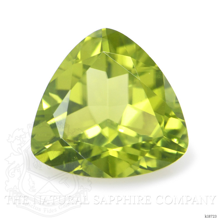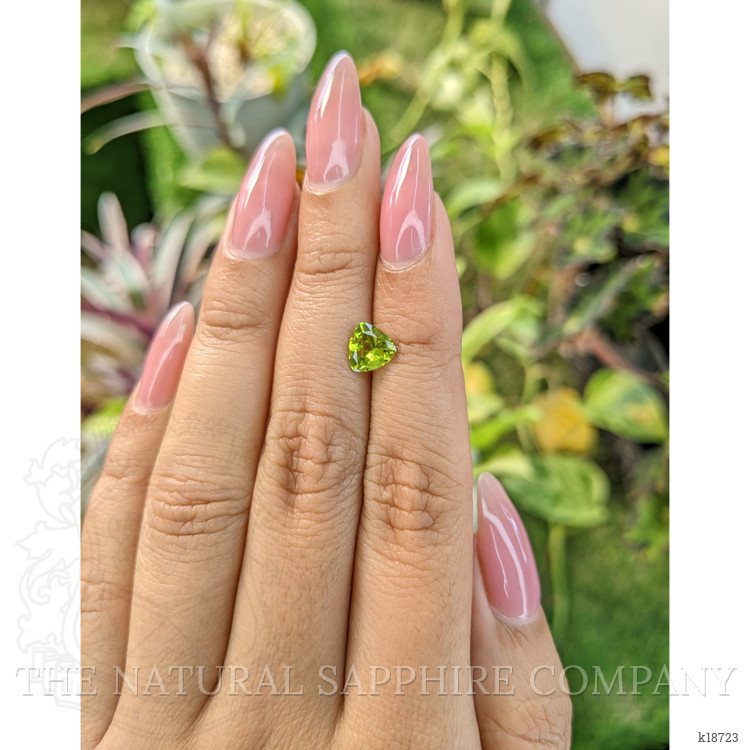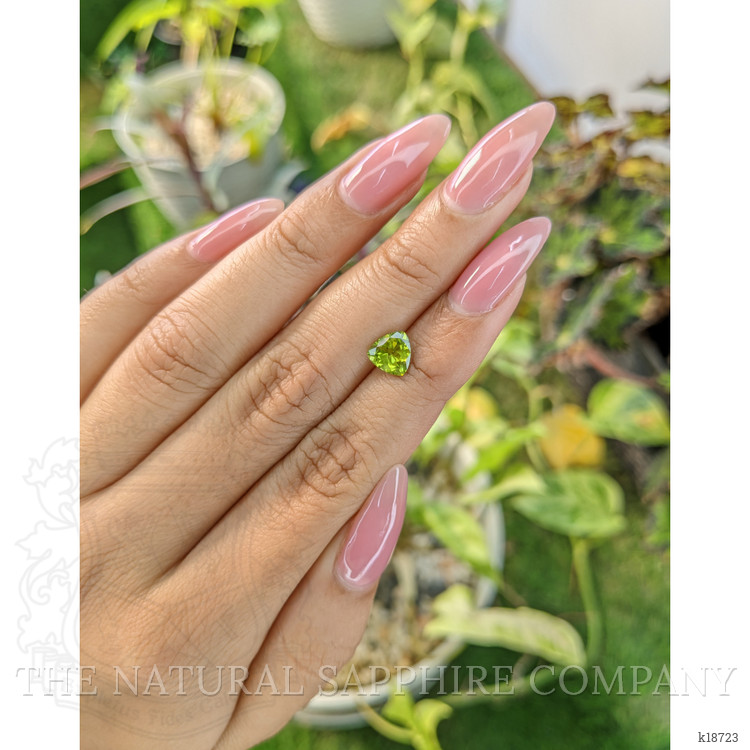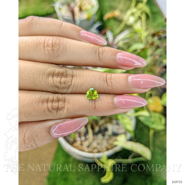 From deep within the ancient volcanic soils of Brazil a crystal slept for millennia, slowly forming its distinctive olive to yellowish green hue under the earths pressure and heat. Miners working small scale operations in well known Brazilian localities uncovered a crystal that caught the light differently, a clean and transparent rough that promised brilliance. The Natural Gemstone Company brought this rough to expert hands, where careful planning guided each facet. The result is a precise trillion shape weighing 1.04 carat, with dimensions of 6.75 x 6.96 x 3.61 mm, cut to maximize scintillation and deliver even light return from the center to each corner. The intense color intensity is lively yet elegant, the clarity grade is very very slightly included evaluated at eye level, and the polish is excellent, all achieved with no enhancement, preserving the stone in its naturally formed state. The trillion cut gives this peridot a contemporary silhouette, while the untouched origin in Brazil and the gemological integrity provide a story that can be passed from hand to hand.