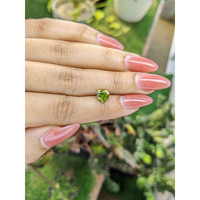 From a gemological perspective this peridot derives its distinctive sparkle from the intrinsic properties of olivine, the mineral family to which peridot belongs, with a composition best described as magnesium iron silicate. Olivine crystallizes in the orthorhombic system, and peridot is biaxial, which means it exhibits measurable birefringence. Typical refractive index values for peridot fall in the approximate range of 1.65 to 1.69, with birefringence on the order of 0.036 to 0.039, and these optical parameters cause incident light to be split and redirected within the stone. The mixed brilliant faceting style employed in this heart shape optimizes that internal light behavior, using a brilliant style crown to promote sparkle and a stepped or modified pavilion to control light return and dispersion. The precision of the cut, combined with the excellent polish, maximizes contrast and scintillation so that even small movements produce a lively pattern of flashes. The intense yellowish green hue is uniformly distributed, which means light passing through the stone encounters a consistent medium for refraction and reflection, reinforcing the perception of depth and glow rather than appearing patchy or dull.