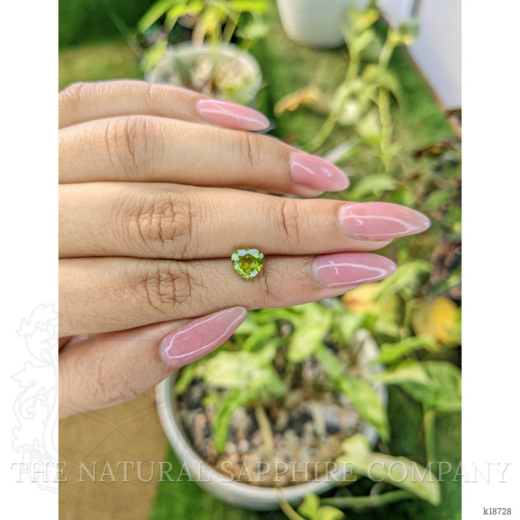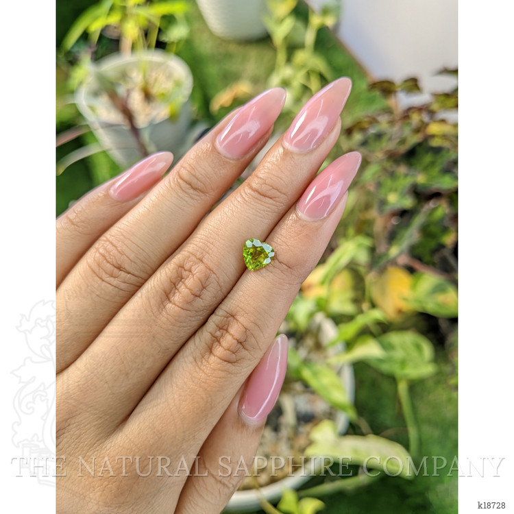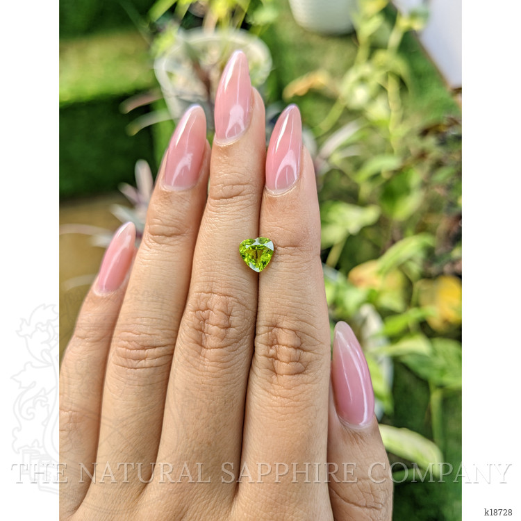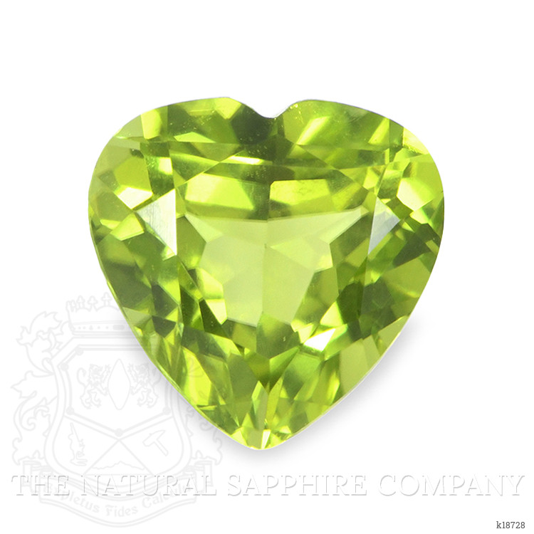 This heart shaped peridot from The Natural Gemstone Company is a precisely executed 1.46 carat gem with dimensions of 7.04 x 7.12 x 4.44 mm, and a mixed brilliant cut designed to maximize both scintillation and color saturation. The cutter has maintained excellent symmetry between the lobes and a well defined cleft at the apex, producing balanced light return across the table and crown facets. The facet junctions exhibit an excellent polish, which enhances windowing control and preserves intense color intensity. At the stated proportions the stone has an approximate depth of 62.7 percent based on the average diameter, a depth that supports strong body color without sacrificing brilliance. Clarity has been graded very very slightly included when evaluated at eye level, with only minute inclusions detectable under moderate magnification, leaving the visual transparency effectively clean in face up presentation. No enhancement has been applied, and the piece is a natural Brazilian peridot, offering the distinct yellowish green hue prized in gems from that locality.