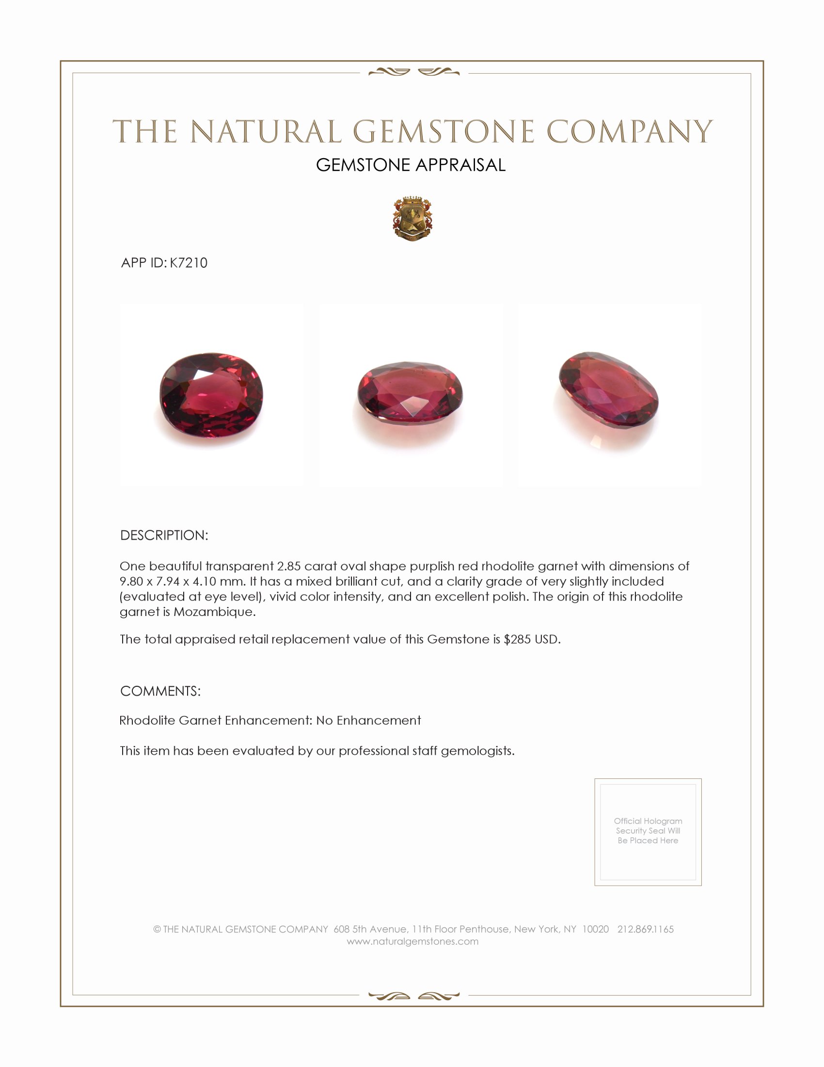 The Natural Gemstone Company proudly presents an exquisite gem that stands as a testament to unparalleled quality and timeless elegance—a transparent 2.85 carat oval-shaped purplish red rhodolite garnet. In a world where gemstones compete in terms of allure and rarity, this particular specimen offers qualities that set it apart as a superior choice. Unlike other gemstones commonly found on the market, this rhodolite garnet boasts a unique origin that significantly enhances its value, making it a distinguished investment for any discerning collector or jewelry enthusiast.