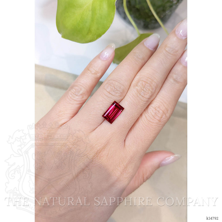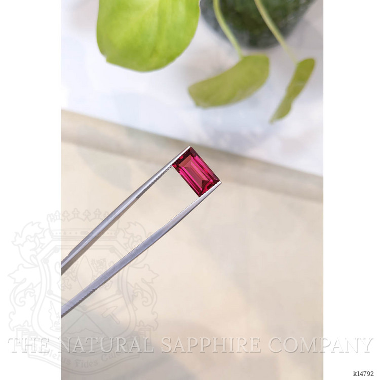 The emerald cut, known for enhancing the gemstone’s clarity, transforms this rhodolite garnet into a masterpiece of precision. Measuring 12.02 x 7.41 x 4.38 mm, its eye-clean clarity grade ensures that every facet gleams brilliantly, free from inclusions visible to the naked eye. The excellent polish applied by our expert craftsmen brings out the full spectrum of color and light, making the garnet’s surface a radiant canvas that captures and reflects its fiery hues.