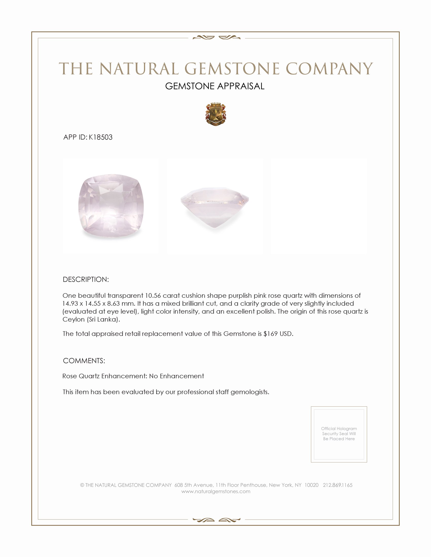 As a representative of The Natural Gemstone Company I can confidently say this gem offers outstanding value, combining rare transparency, natural provenance, and expert cutting for maximum visual appeal, making it a superior alternative to common opaque rose quartz and a more affordable, honest option versus treated or lab enhanced pink gemstones. The combination of a cushion silhouette, mixed brilliant cut, and excellent polish means the finished setting will retain sparkle and presence for years, and the no enhancement status protects long term investment and resale appeal. If you are comparing options for a special commission or an heirloom piece, this Ceylon purplish pink rose quartz is a compelling, trustworthy choice.