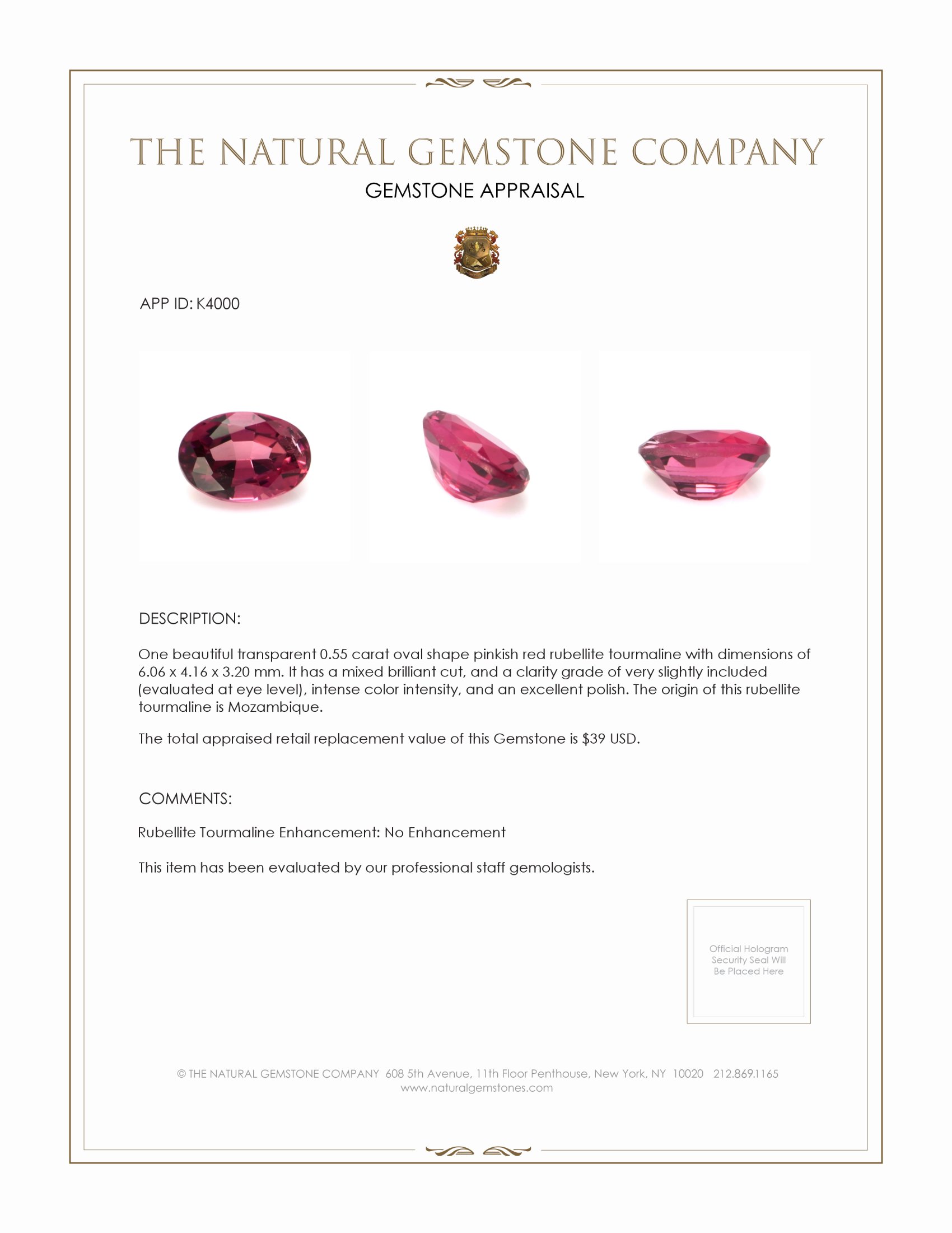 From the mineral-rich landscapes of Mozambique, the journey of this exquisite 0.55-carat oval shape pinkish red rubellite tourmaline begins in the heart of a land renowned for its stunning gemstone deposits. Nestled in the region's rich bedrock, this rubellite tourmaline lay hidden for countless millennia, waiting for a skilled hand to unearth its inherent brilliance. At The Natural Gemstone Company, we pride ourselves on sourcing gems from places where nature's beauty meets remarkable quality to bring to life the most captivating pieces for the discerning buyer. Each gemstone's story starts deep within the earth's core, where time crafts a rare blend of color, clarity, and character.