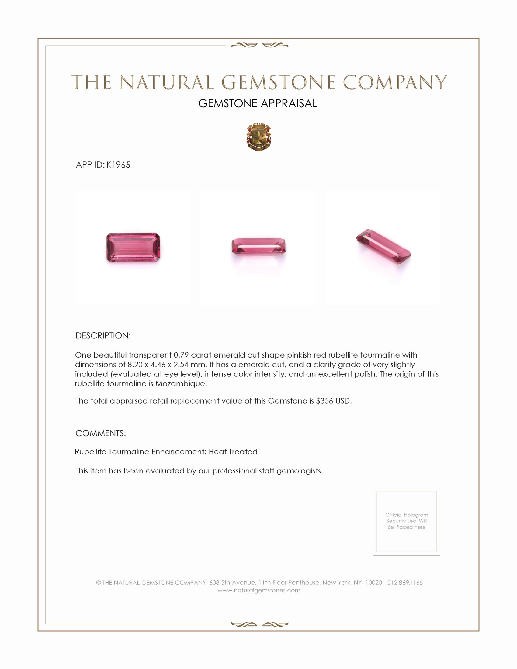 The dimensions of this gemstone, precisely measured at 8.20 x 4.46 x 2.54 mm, effortlessly enhance its presence, ensuring that whether set in an engagement ring or as the focal point of a collector's array, it demands admiration and intrigue. Its emerald cut grants the rubellite a refined symmetry, offering a dance of light that captivates the onlooker and casts a spell of radiance and depth. With a clarity grade of very slightly included when viewed at eye level, this stunning gem maintains an enchanting appearance, complete with natural intricacies that add to its unique character.