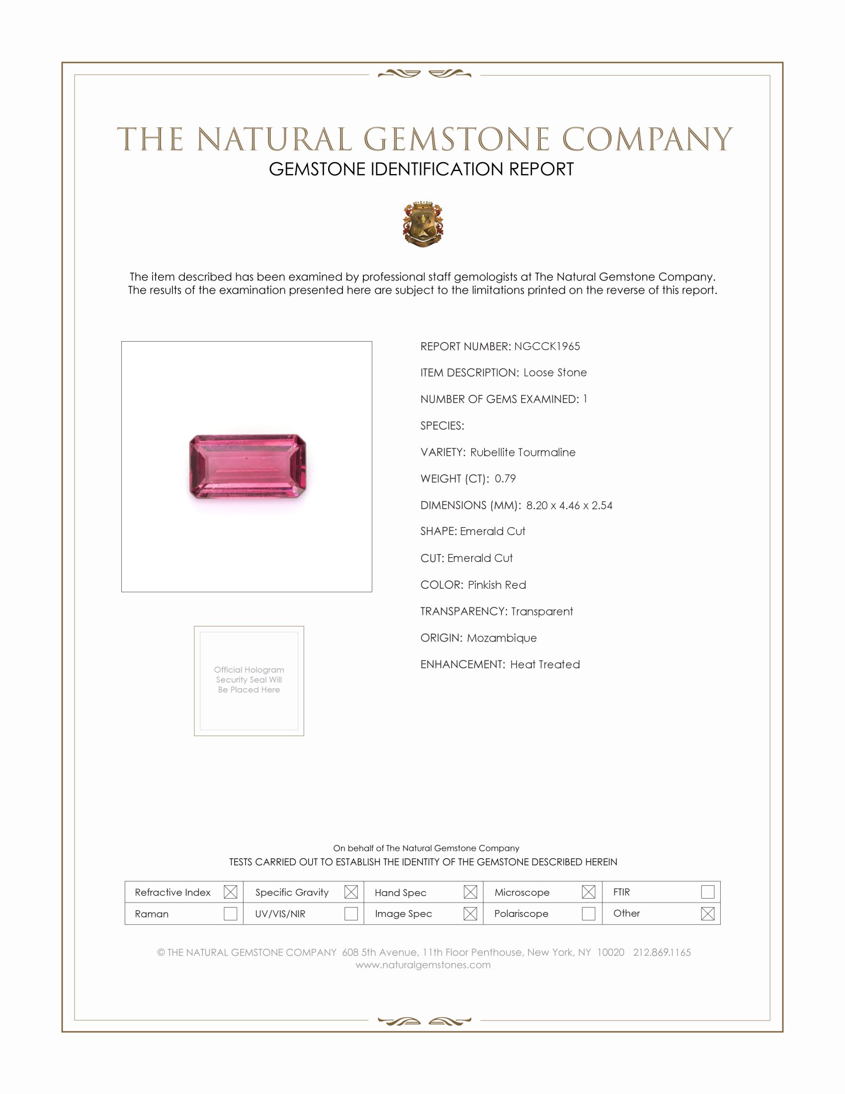 Discover the breathtaking allure of our exquisite pinkish red rubellite tourmaline, crafted to perfection in an enchanting emerald cut. Weighing in at a perfect 0.79 carats, this gemstone embodies both elegance and brilliance, making it an ideal choice for those in search of a statement piece that transcends time. At The Natural Gemstone Company, we understand that your quest for the ideal gem is not just about finding something beautiful but also discovering a treasure that speaks to your individual vision. Our rubellite, hailing from the renowned mines of Mozambique, serves as that ultimate answer to your search.