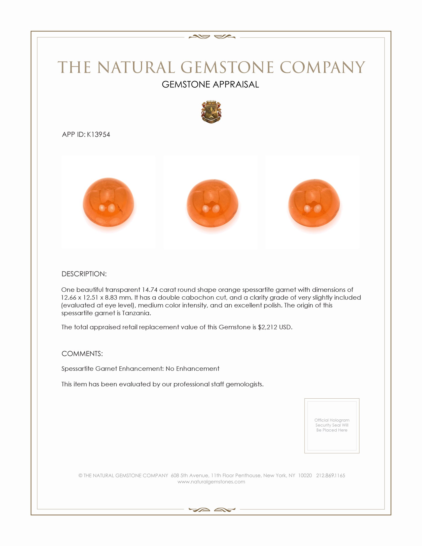 The story of the spessartite garnet stretches back through the annals of time, as this captivating gemstone has been revered for its vibrant hues and unique characteristics. Our beautiful transparent 14.74 carat round spessartite garnet is a shining example of this gemstone's storied legacy, steeped in ancient origins and favored by those who value tradition and lasting beauty. Sourced from the rich lands of Tanzania, a locale renowned for producing some of the world's most exquisite gemstones, this spessartite garnet stands as a testament to nature's bounty and the diligent craftsmanship that brings it to perfection. At The Natural Gemstone Company, we offer this stunning gemstone defined not only by its impressive carat weight but also by its striking double cabochon cut and excellent polish, ensuring it captures light in the most mesmerizing way.