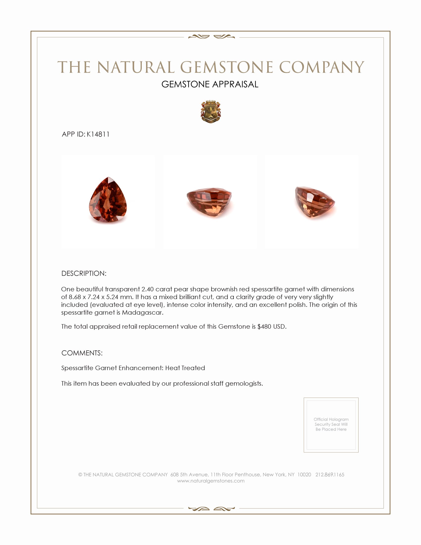 In the lush landscapes of Madagascar, where the rich earth cradles hidden treasures, began the journey of this exquisite 2.40 carat spessartite garnet. The heartland was quiet, save for the whispers of winds passing through ancient stones, where nestled deep beneath the surface, this brownish-red gem awaited its destiny. As miners unearthed this wonder, its intense color intensity immediately sparked a sense of awe, a fiery spirit reflecting the warmth of the earth itself. With gentle hands, it was carefully released from its mineral hug, beginning a voyage that would soon touch many lives.