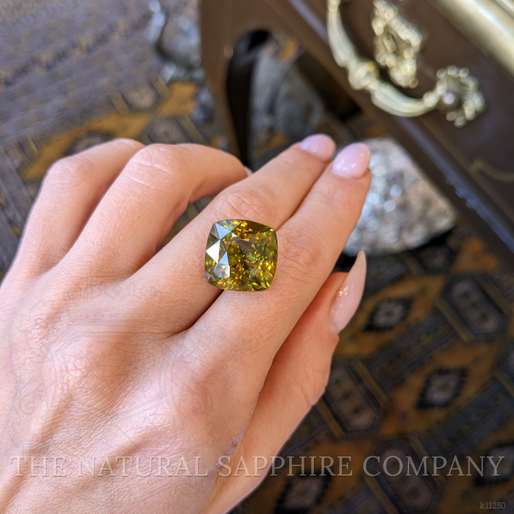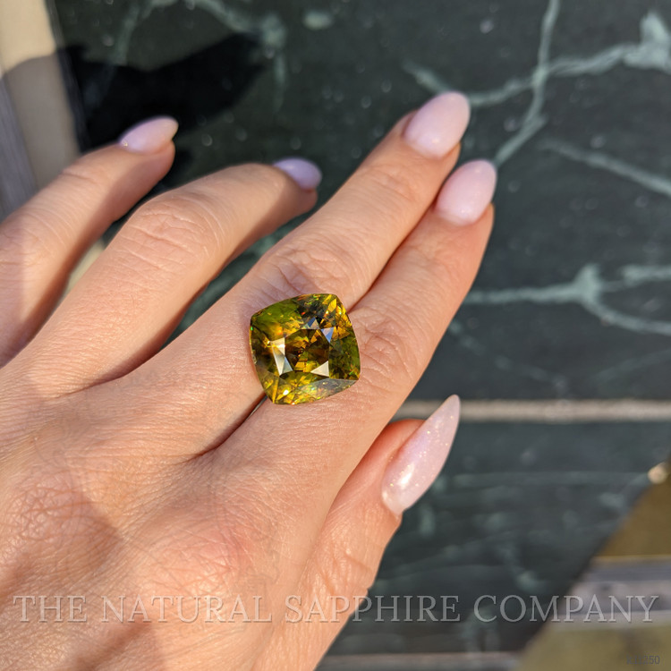 The handcrafted 20.99 carat yellowish brown sphene, presented by The Natural Gemstone Company, embodies the elegance and charm of Madagascar's rich mineral landscape. As a highly coveted gemstone, sphene, also known as titanite, stands out in the world of gems due to its amazing optical qualities, offering a lustrous vista that few can match. Our sphene's cushion shape with dimensions of 14.85 x 14.78 x 12.06 mm showcases the meticulous craftsmanship involved in its creation. Its mixed brilliant cut enhances the gemstone’s innate ability to reflect light, resulting in a brilliant display that captivates onlookers. The stone’s intense color intensity and excellent polish further amplify its dazzling appearance, making it a true testament to nature's splendor combined with human artistry.