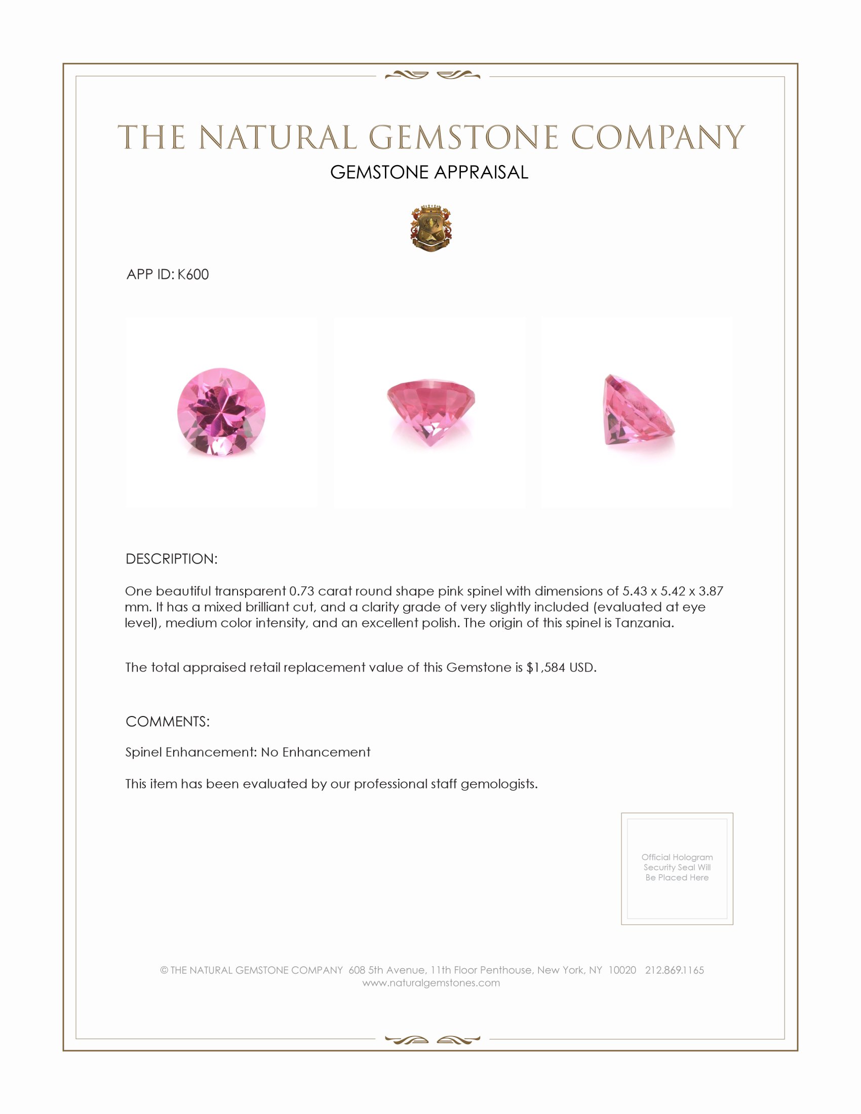 Introducing a gemstone that effortlessly stands out in the world of fine jewelry: the beautiful transparent 0.73 carat round shape pink spinel from The Natural Gemstone Company. This exquisite gemstone, with its dimensions measuring 5.43 x 5.42 x 3.87 mm, captures both attention and admiration with its vibrant hue and superb craftsmanship. Unlike many other gemstones, which may appear dull under certain lights or settings, our pink spinel boasts a remarkable medium color intensity that remains lively and captivating no matter how it's worn. Its round shape and mixed brilliant cut also contribute to its unparalleled sparkle, creating a radiant effect that viewers will find unforgettable.