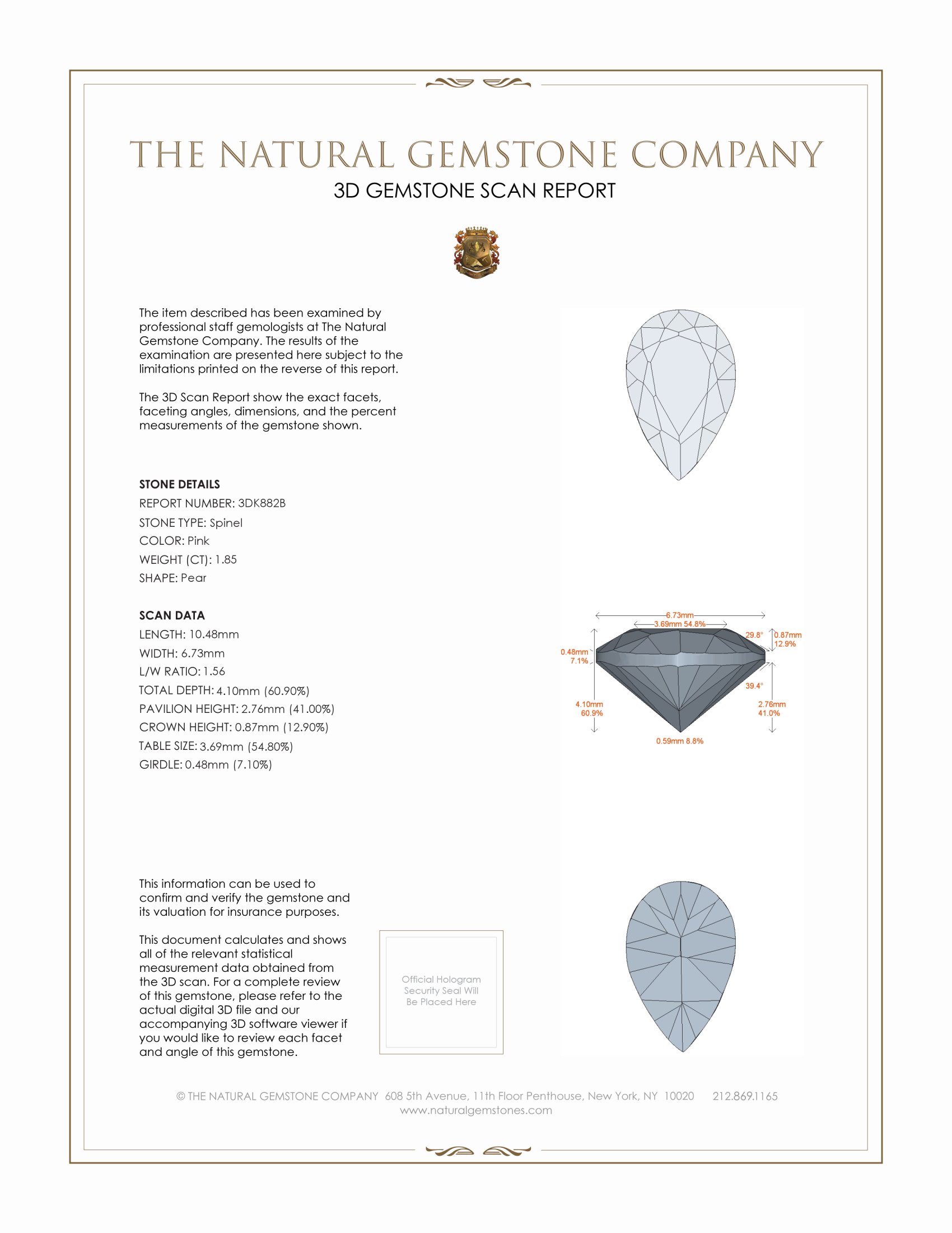 The Natural Gemstone Company proudly presents a stunning transparent 1.85 carat pear-shaped pink spinel, sure to captivate even the most discerning gemstone connoisseurs. Originating from the renowned mines of Tajikistan, this exquisite gem possesses dimensions of 10.48 x 6.73 x 4.10 mm, offering a perfect balance between size and symmetry. Its pear shape is expertly crafted with a mixed brilliant cut, carefully designed to maximize the play of light and showcase the gem's inherent brilliance. The precision of this cut reflects our commitment to excellence in craftsmanship, ensuring that every facet contributes to the stone's overall sparkle and elegance.