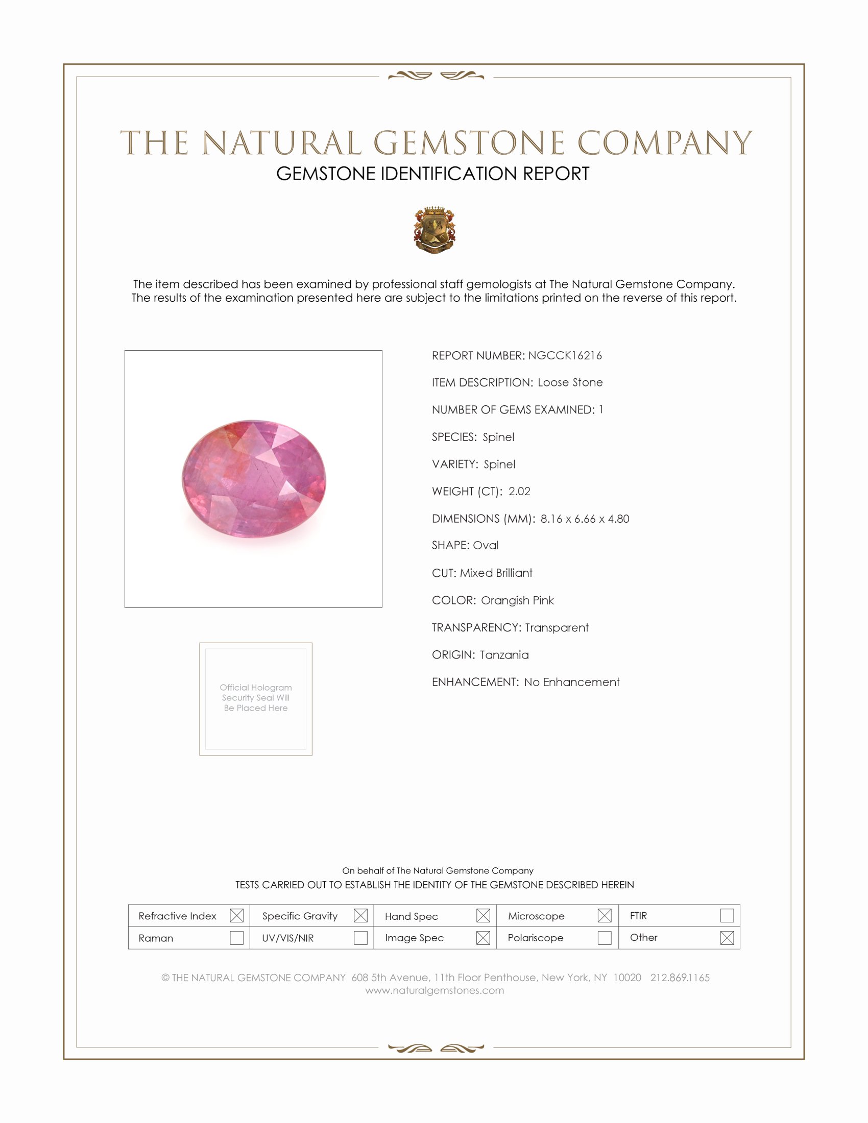Moreover, this spinel remains untreated and unenhanced, affirming its status as a pure and natural marvel from the distinguished lands of Tanzania. This authenticity resonates through every facet and angle, combining the earth's artistry with human craft to yield a masterpiece of color and clarity. Its uniqueness is a testament to the raw elegance found in nature, ensuring each spinel remains distinctly its own, exuding a narrative of earthly origins and artisan refinement. With The Natural Gemstone Company, you secure not just a gemstone, but a testament to the enduring beauty and investment of timeless elegance.