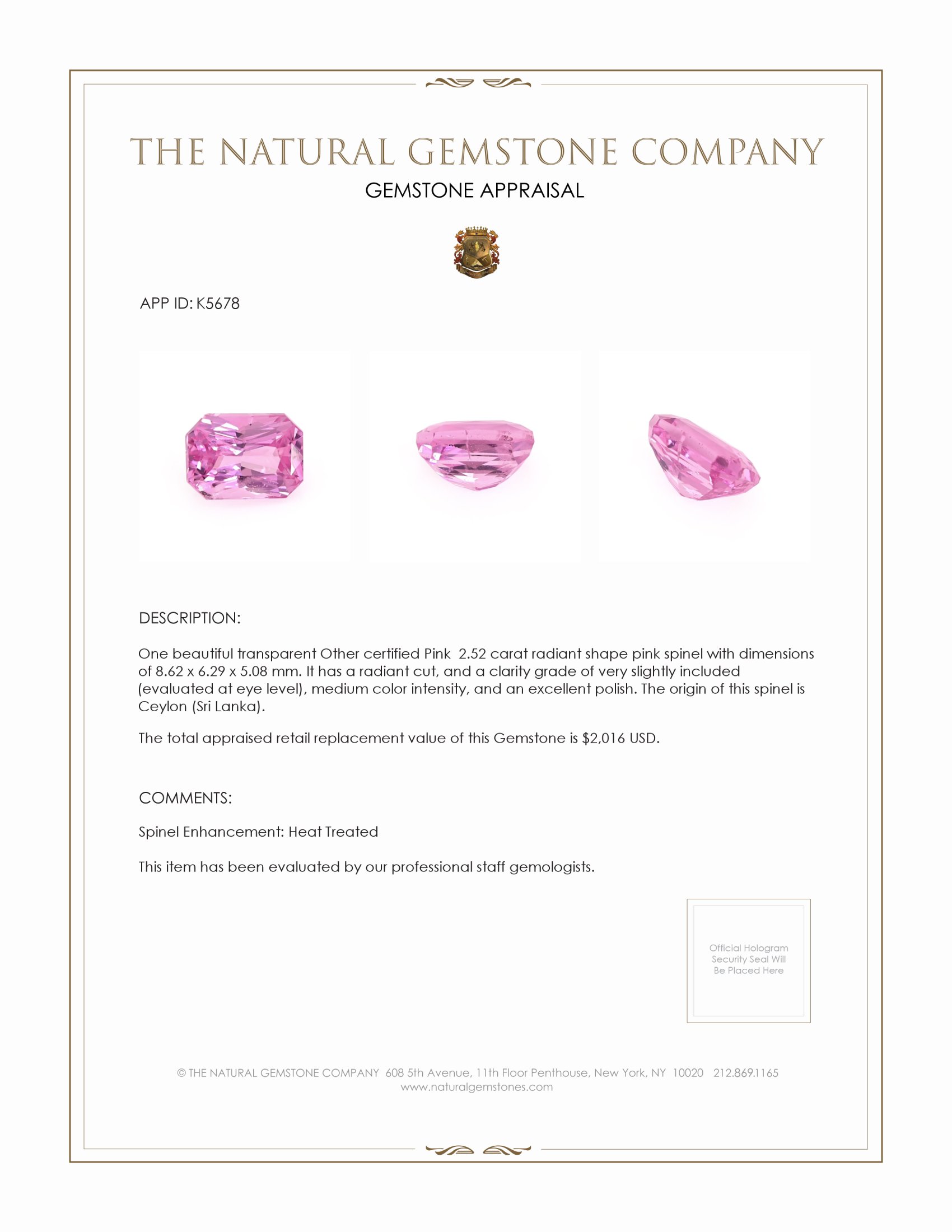 Introducing a gemstone of unparalleled elegance and exclusivity, this 2.52 carat radiant pink spinel is the perfect addition to any high-end gemstone collection. With its exquisite radiant shape, this gemstone is a testament to both its rare beauty and the skillful craftsmanship that has gone into its creation. Mined from the storied lands of Ceylon, now known as Sri Lanka, this spinel’s origin enhances its unique allure, offering collectors a piece steeped in rich history and culture.