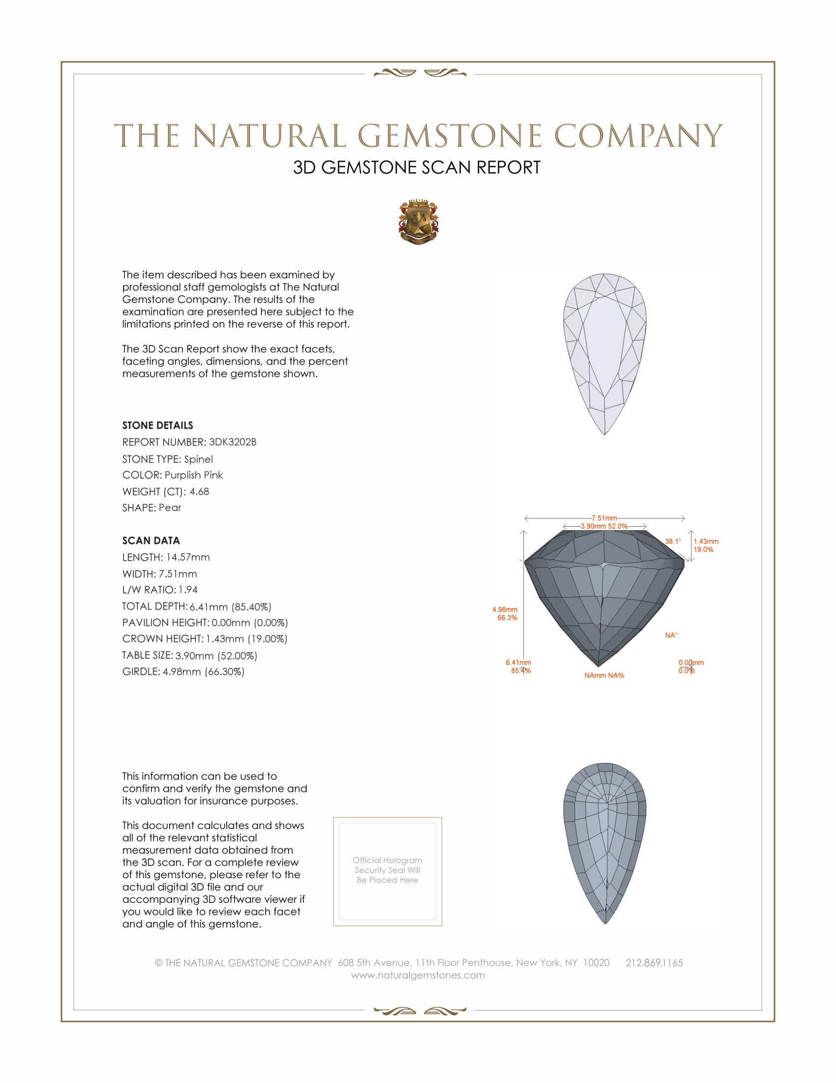 The artisans at The Natural Gemstone Company recognized its potential and embarked on a meticulous process of transformation, honoring the spinel's natural splendor and coaxing it into its breathtaking final form. Through expert hands, it was shaped into an elegant pear, its dimensions crafted with precision, yielding a stone that measures 14.57 x 7.51 x 6.41 mm. The gemstone's mixed brilliant cut allows it to catch light in a dance of sparkle and color, each facet strategically cut to amplify its medium color intensity, giving life to its purplish pink hues. With an eye-clean clarity grade, the spinel offers absolute transparency, revealing no inclusions visible to the naked eye, a testament to the skill and care inherent in the craftsmanship and grading processes.