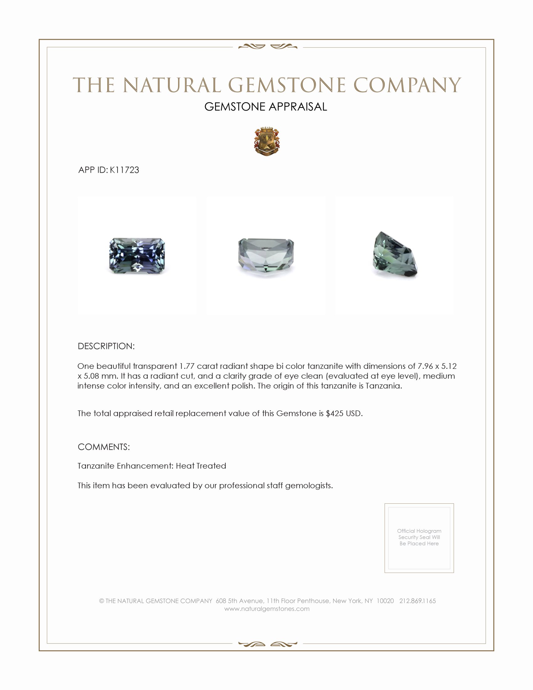 In the heart of a land kissed by the sun and whispered to by the moon, where the horizon stretches in an endless waltz between dawn and dusk, there lies a secret unveiled?—the captivating allure of tanzanite. This particular gem, a beautiful 1.77 carat radiant shape bi-color tanzanite, draws upon the mystique of its homeland, Tanzania. From the moment it emerged from the embrace of the Earth, it has carried with it the splendor of the heavens captured in its transparent shimmer and hues that tell tales of eternity.