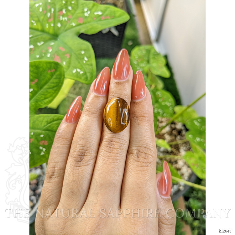 The Natural Gemstone Company is proud to present a distinguished specimen of nature's artistry, a breathtaking oval-shaped tiger's eye gemstone. Weighing a substantial 10.95 carats with precise dimensions of 19.60 x 14.67 x 4.90 mm, this gemstone exudes both size and presence, a statement on its own. Its cabochon cut enhances the stone's inherent qualities, serving as a testament to the well-honed skills and meticulous standards upheld by master gemstone artisans. Unlike faceted stones, the cabochon cut displays an impeccable curvature that amplifies the golden brown hue through the smooth and flowing contours of the stone, ideally capturing the optical phenomenon known as chatoyancy, which closely resembles the narrow, illuminating slit observed within a cat’s eye. This particular optical intrigue is magnified by the cabochon's elliptical surface, a decision in craftsmanship that aligns perfectly with the natural fibrous structure inherent to tiger's eye stones.