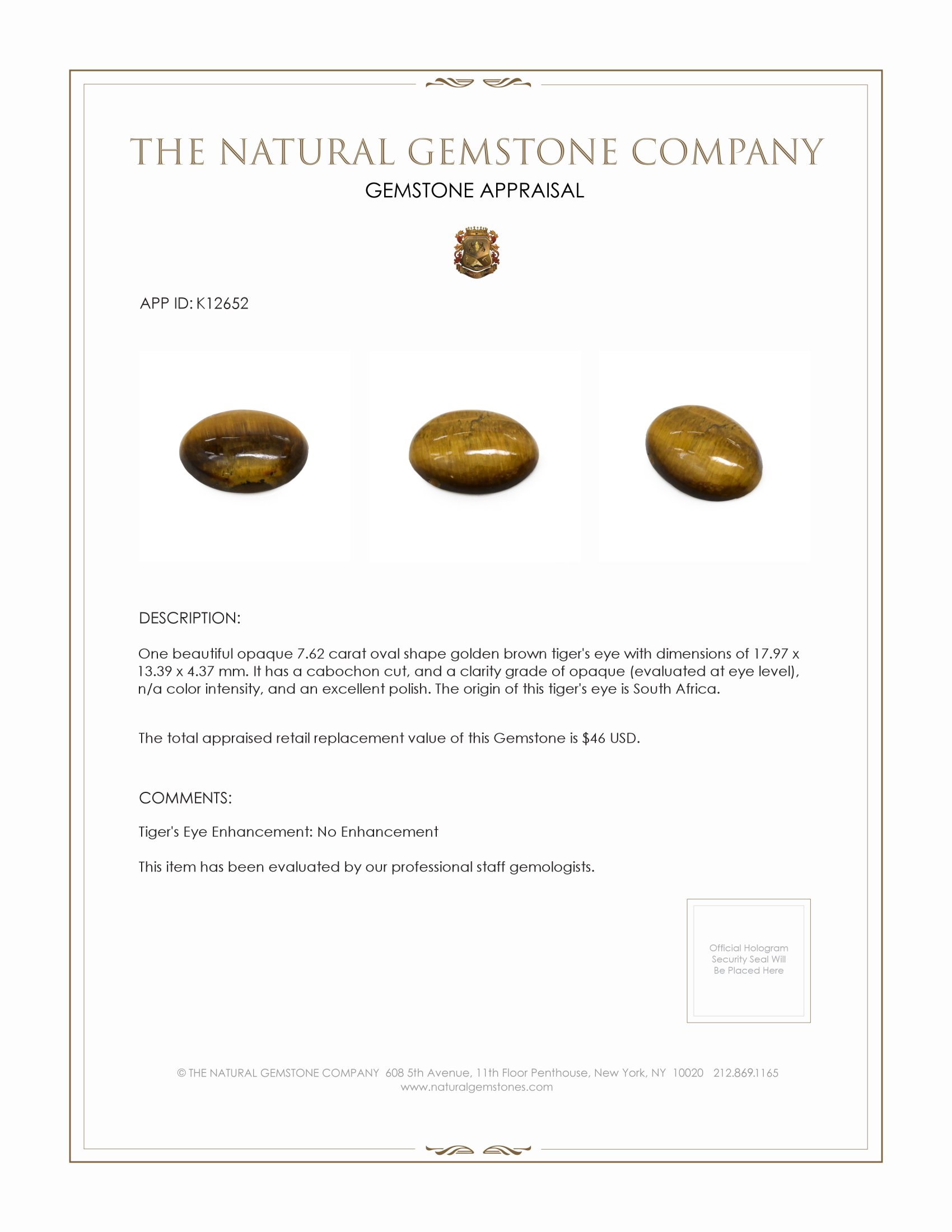 The Natural Gemstone Company proudly presents a distinguished option for an engagement gemstone — a beautifully opaque, oval-shaped tiger's eye. Weighing an impressive 7.62 carats, this stunning stone exhibits dimensions of 17.97 by 13.39 by 4.37 mm. Focused on capturing the essence of natural beauty, this gemstone features a cabochon cut, enhancing its inherent opalescent qualities. This method of cutting emphasizes its smooth, rounded surface devoid of facets, allowing for a generous and reflective play of light across its surface, which is particularly desirable in tiger's eye due to its inherent layering and beautiful luster.