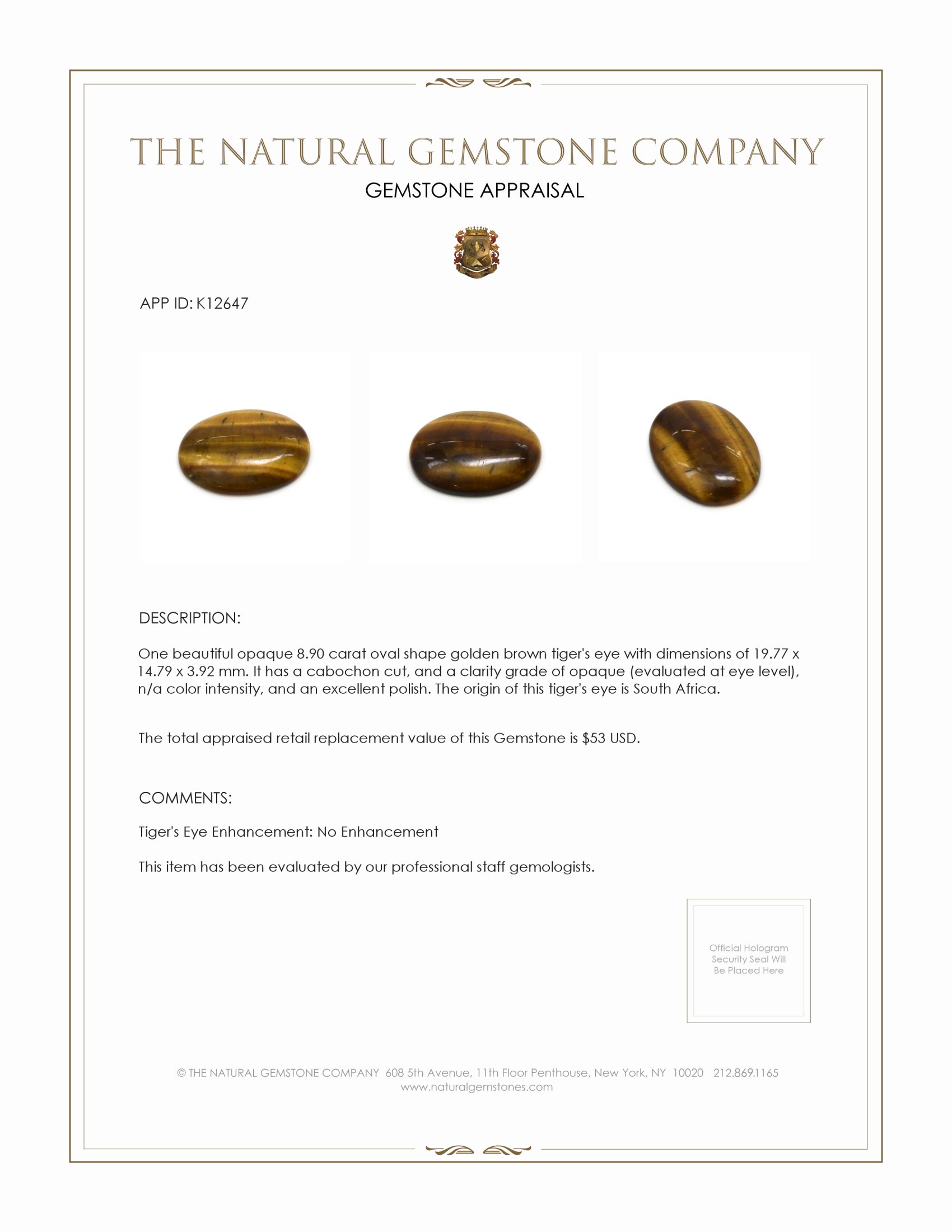 In the realm of timeless beauty where dreams converge with reality, there exists a treasure that captures the romance of eternity. Bathed in the warm glow of golden brown hues, the exquisite tiger's eye awaits the beholder's gaze. This enchanting gemstone, weighing an impressive 8.90 carats, emerges from the heart of South Africa, a land where nature's artistry knows no bounds. Its oval shape, with dimensions measuring 19.77 x 14.79 x 3.92 mm, serves as a testament to the earthly wonders from which it is born, each facet a whisper of the infinite love and connection it symbolizes.