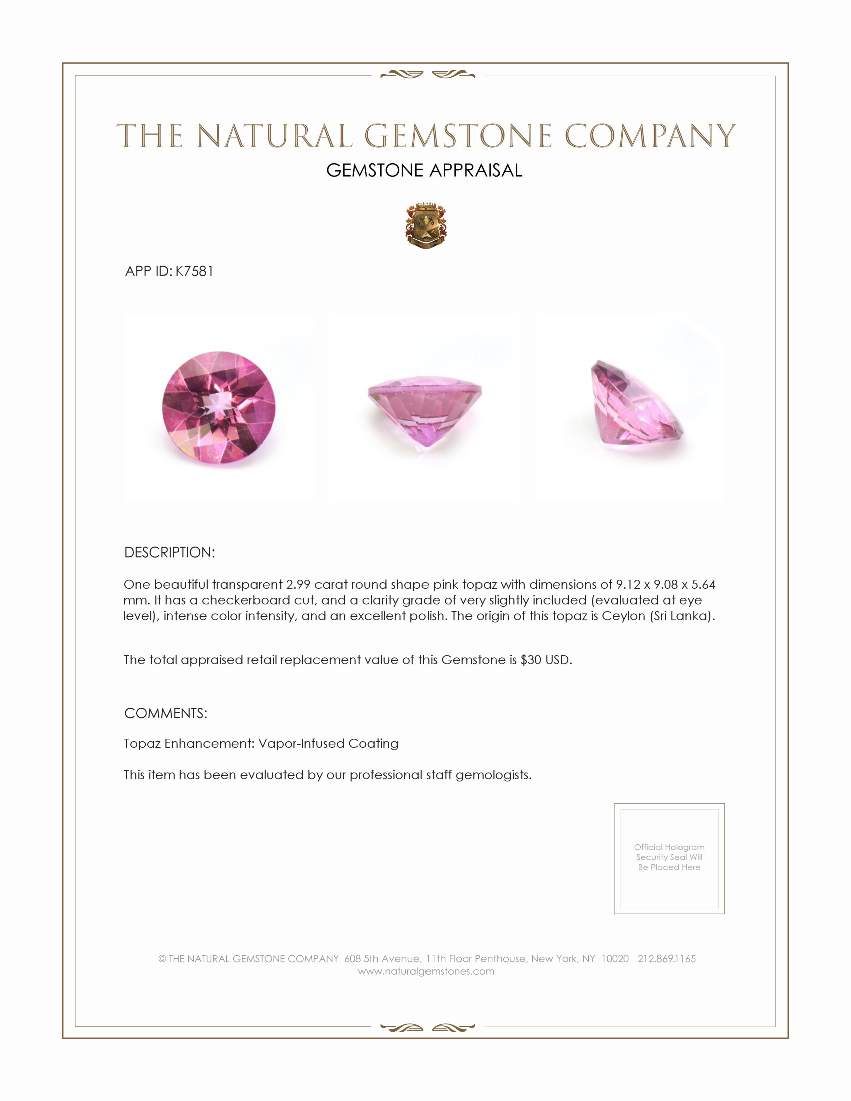Imagine a world where magic touches your very fingertips, where a single stone can evoke emotions that words often fail to capture. In the heart of this enchanting realm lies our magnificent 2.99 carat round pink topaz, a gemstone that promises not only to captivate but also to create memories that will linger for a lifetime. At The Natural Gemstone Company, we invite you to embrace the exquisite beauty that this topaz offers—a luxury that engages your senses and delivers joy time and time again.