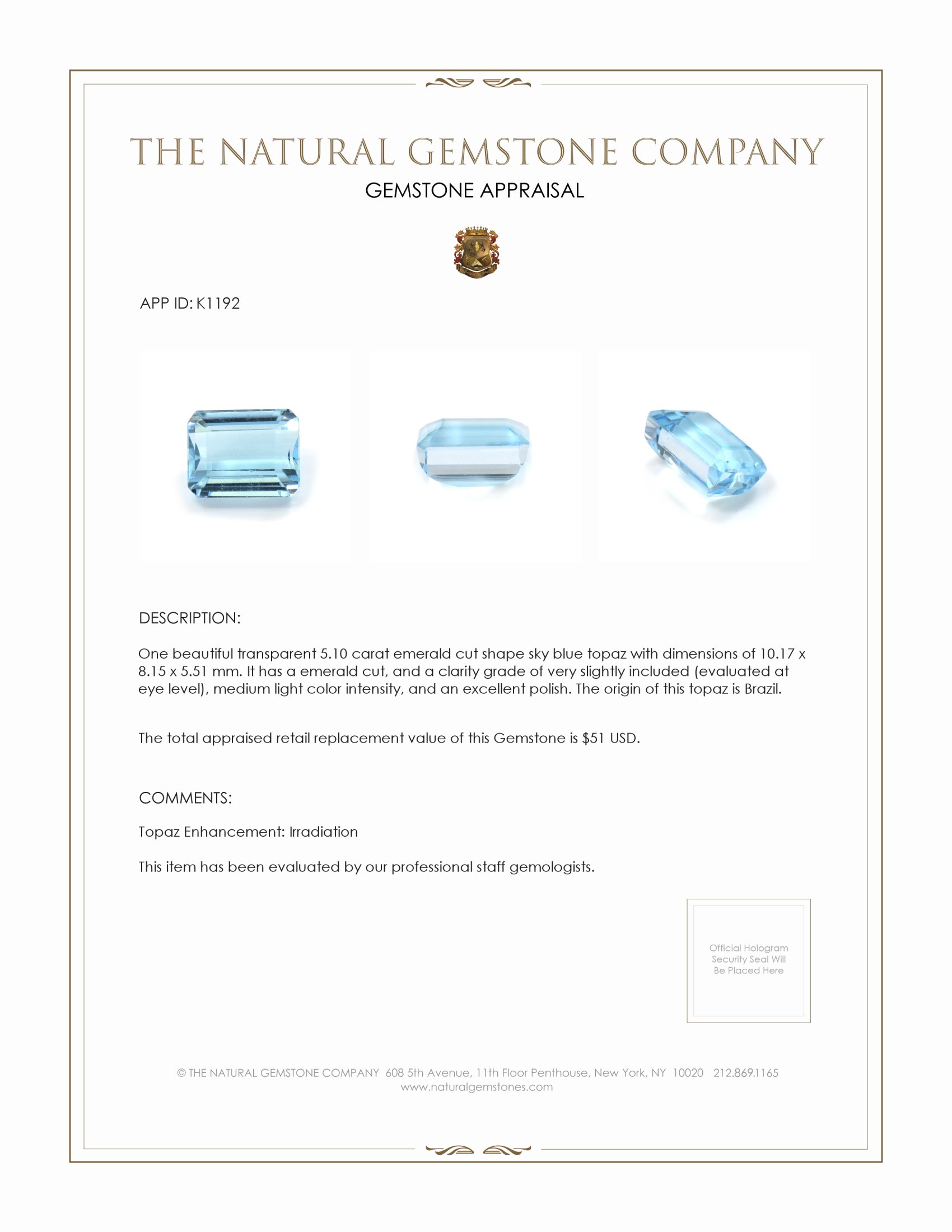 In the heart of Brazil's lush landscapes, where the sky dances in shades of serene blue, an extraordinary gemstone begins its journey. Nestled deep within the earth's embrace, this sky blue topaz reflects the tranquil serenity of a morning sky kissed by the gentle warmth of the rising sun. At 5.10 carats, its transparent beauty is a testament to nature's artistry, capturing the essence of Brazil's vibrant spirit and the whispering tales of ancient civilizations that revered such marvels of nature. The emerald cut, precise and elegant, has adorned the crowns of royalty and the necks of the discerning for centuries, bridging the realms of earth and sky with timeless grace.