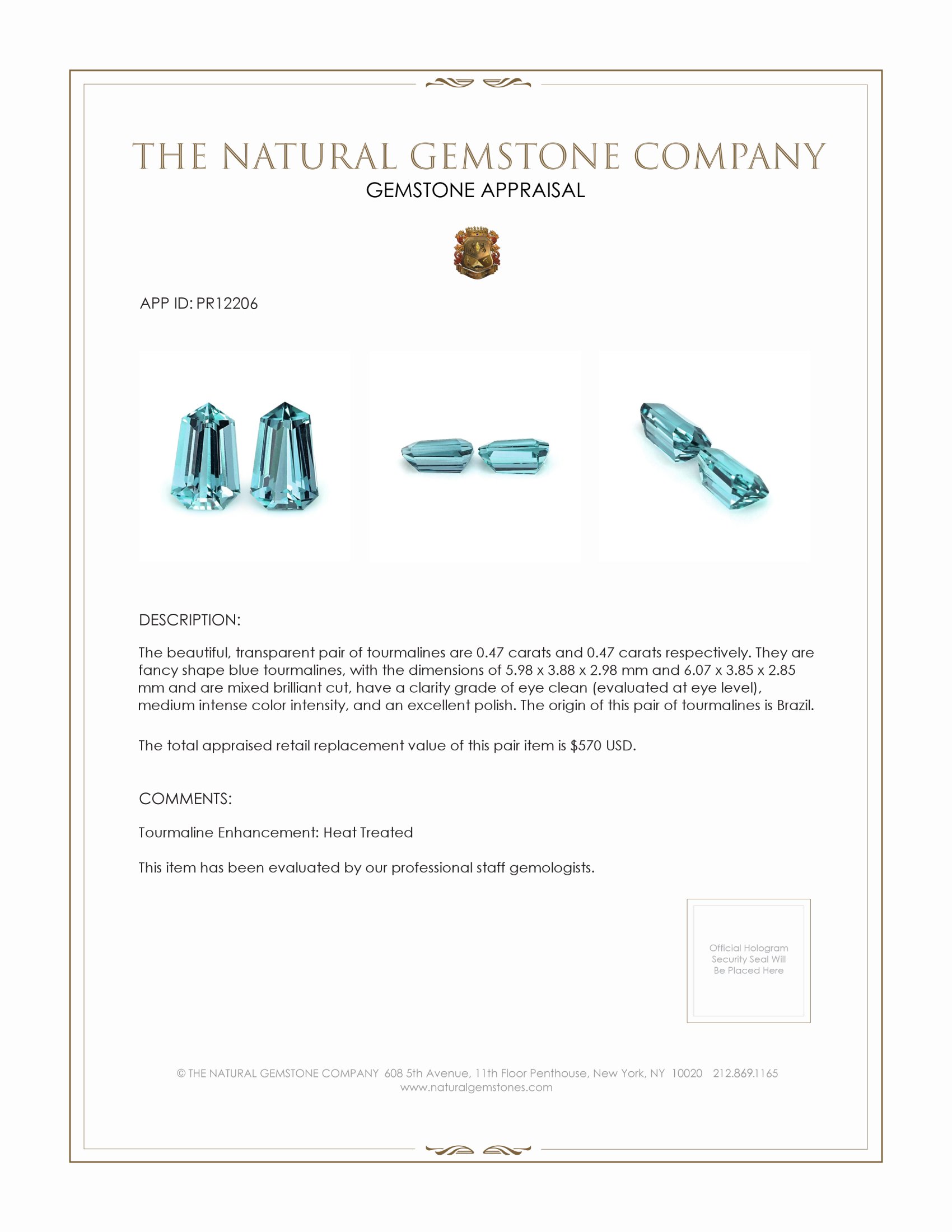 This exquisite, transparent pair of blue tourmalines from The Natural Gemstone Company embodies refined rarity and timeless elegance. Each stone weighs 0.47 carats, presented in a fancy shape that captures a cool, oceanic tone. The stones measure 5.98 by 3.88 by 2.98 millimeters and 6.07 by 3.85 by 2.85 millimeters, respectively, and are expertly faceted in a mixed brilliant cut to maximize scintillation. Evaluated at eye level, both gems are eye clean, displaying a clarity rare for stones of this color, and they present a medium intense color intensity with an excellent polish that reveals their internal transparency. Heat treated to enhance stability and hue, and originating from Brazil, these tourmalines are finished to a museum quality that allows them to perform beautifully in bespoke jewelry.