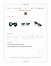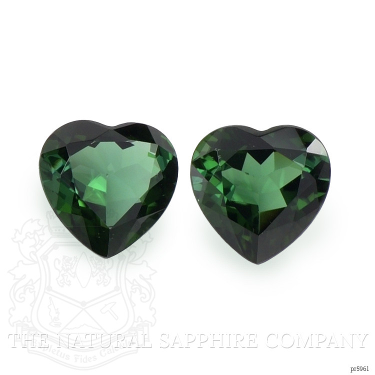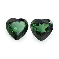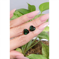 The beautiful, transparent pair of tourmalines are 3.13 carats and 3.33 carats respectively. They are heart shape green tourmalines, with the dimensions of 9.92 x 10.01 x 5.08 mm and 9.97 x 10.02 x 5.56 mm and are mixed brilliant cut, have a clarity grade of very slightly included (evaluated at eye level), vivid color intensity, and an excellent polish. The origin of this pair of tourmalines is Brazil.