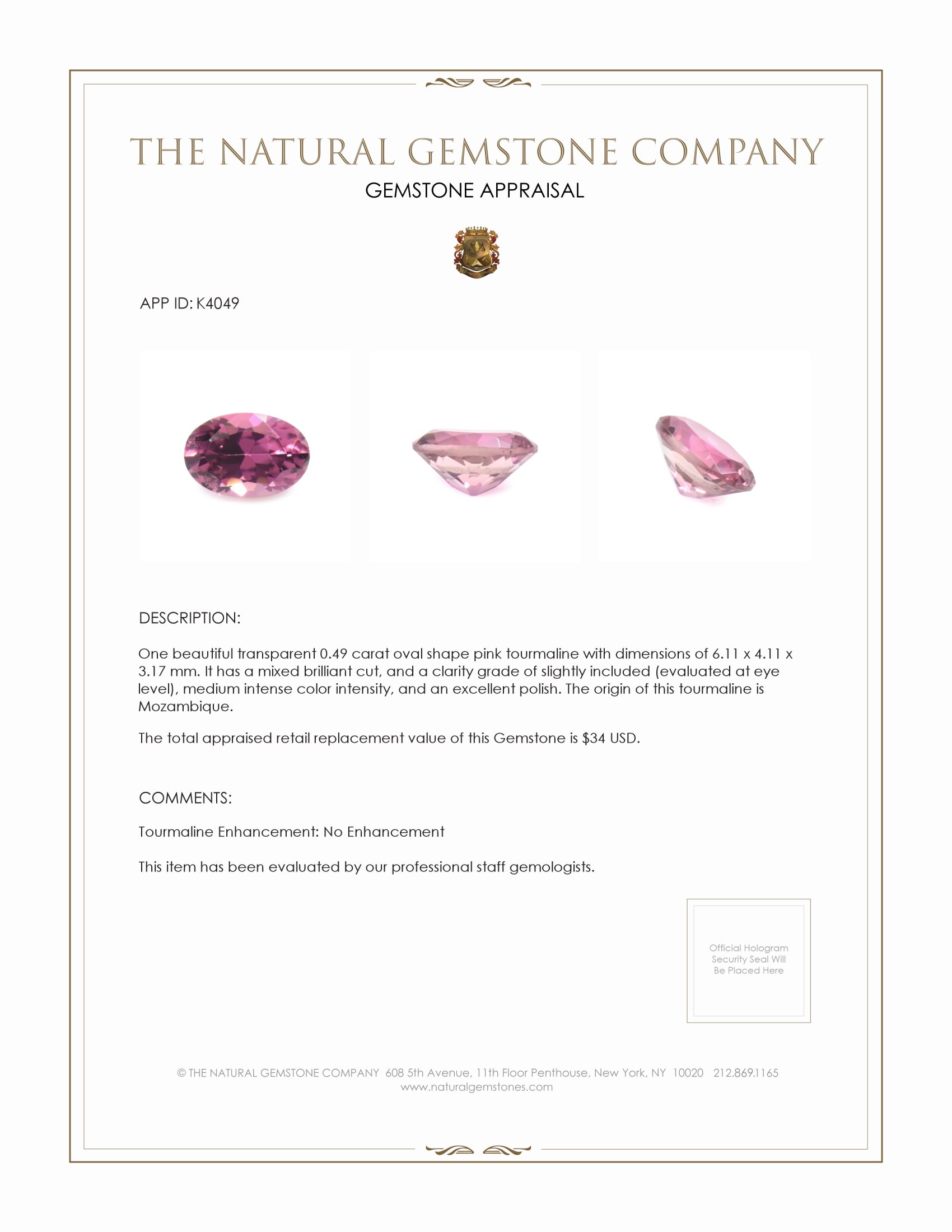 A symbol of timeless elegance and exquisite taste, the 0.49 carat oval-shaped pink tourmaline from The Natural Gemstone Company unveils a world of unparalleled luxury and refined sophistication. Impeccably designed, this gemstone is a testament to the artistry and precision of our experienced artisans. With dimensions of 6.11 x 4.11 x 3.17 mm, it showcases a mixed brilliant cut that captivates with its dazzling effect. Under the gentle gleam of ambient light, its medium intense color radiates a warm yet vivid hue, echoing an eternal charm that captures hearts and ignites passions. This masterpiece, with its clarity grade of slightly included that has been evaluated at eye level, becomes more than just a mere adornment—it is a profound statement of both personal achievement and distinguished taste.