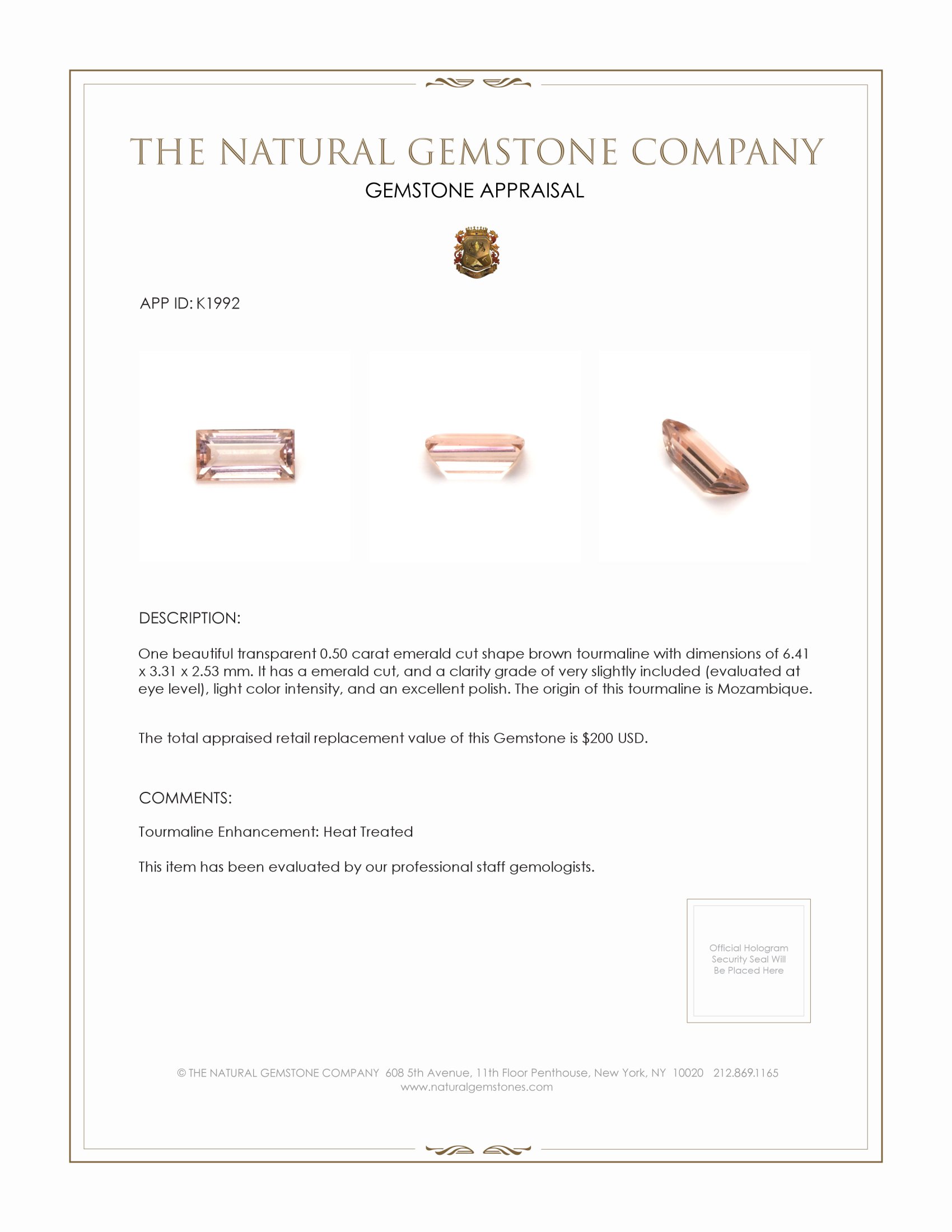 Introducing a captivating gemstone from The Natural Gemstone Company, this transparent 0.50 carat emerald-cut brown tourmaline stands as a testament to breathtaking elegance and superior craftsmanship. With precise dimensions of 6.41 mm by 3.31 mm by 2.53 mm, the proportions of this tourmaline have been meticulously calculated to maximize its aesthetic appeal. The emerald cut, renowned for its large open facets, serves to bestow a mirror-like brilliance upon the gemstone, which presents an unobstructed view into the intricate heart of this remarkable piece. The clarity grade of very slightly included indicates minimal inclusions, remaining mostly invisible to the untrained eye and preserving the gemstone’s transparency. These subtle inclusions act as unique identifiers, singularly distinguishing each stone and enhancing its narrative and character, much like fingerprints do in human beings.