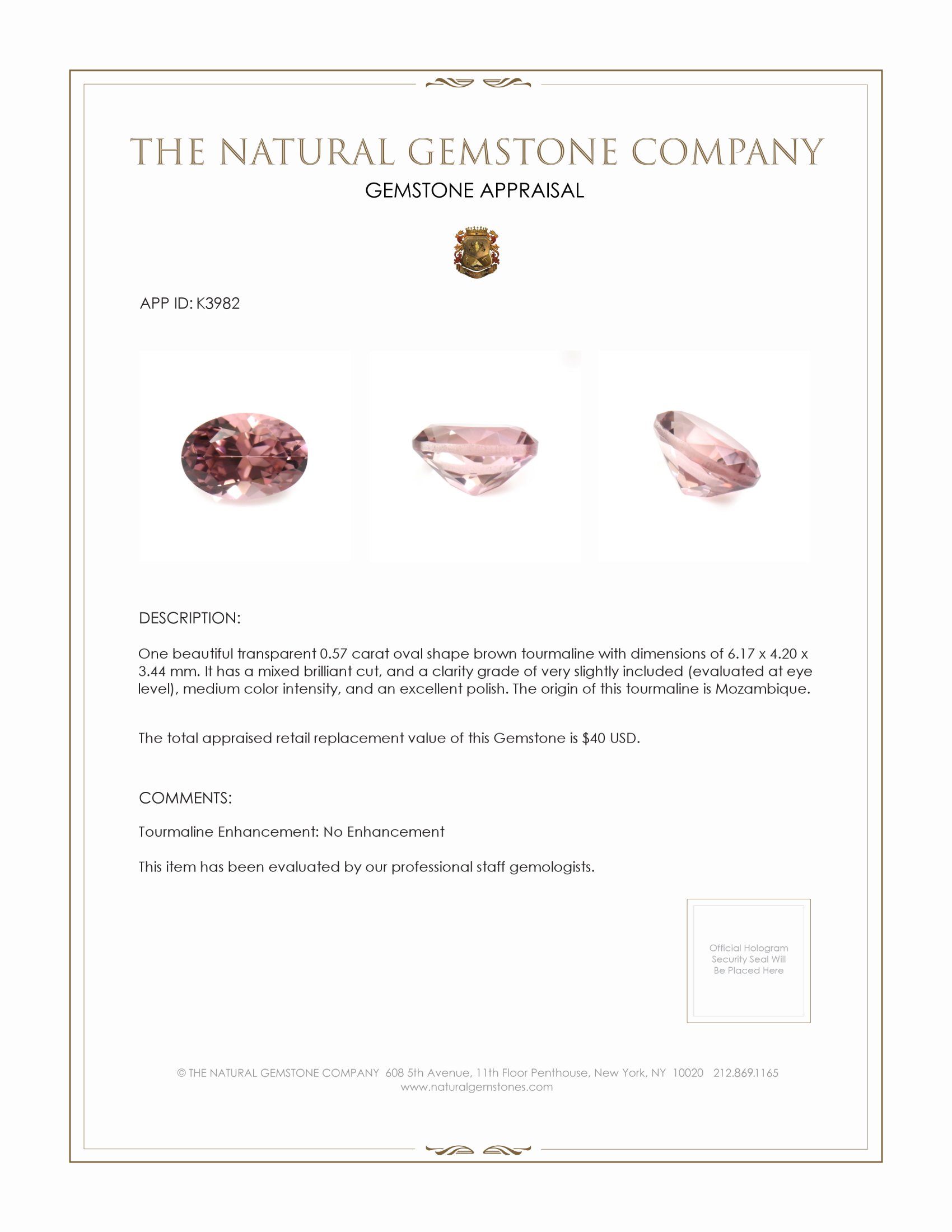 Discover an unparalleled sense of elegance with our exquisite 0.57 carat oval-shaped brown tourmaline, an exceptional gem sourced from the renowned mines of Mozambique. This transparent beauty is a treasure to behold, measuring a precise 6.17 x 4.20 x 3.44 mm and showcasing a mixed brilliant cut that maximizes its captivating sparkle and brilliance. Possessing a clarity grade of very slightly included, carefully evaluated at eye level, the tourmaline radiates a gentle yet profound presence that feels both approachable and exclusive. Its medium color intensity exudes a warm, inviting aura, while the excellent polish accentuates every facet, allowing this gem to catch and reflect light in the most enchanting manner.