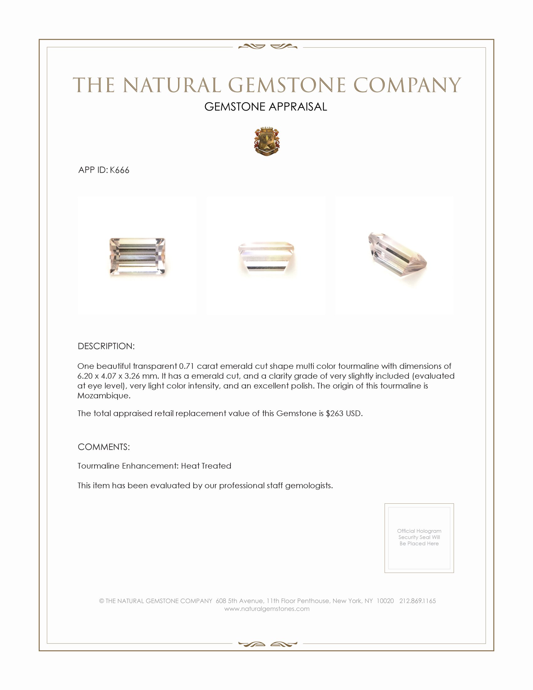 Tourmalines have a storied history that stretches back through time, gracing the thrones of royalty and revered in ancient lore. Our transparent 0.71 carat emerald cut multi-color tourmaline is a tribute to this noble legacy. Sourced from the rich lands of Mozambique, where the earth itself seems to hum with timeless secrets, this gemstone is steeped in tradition. Its very slightly included clarity, evaluated meticulously at eye level, hints at the natural processes that bring such beauty to life. With dimensions of 6.20 x 4.07 x 3.26 mm, each facet of this tourmaline is expertly polished to maintain the highest standards of excellence. It possesses a very light color intensity, imbuing the stone with a gentle allure that echoes the subtle yet profound elegance cherished by connoisseurs through generations.