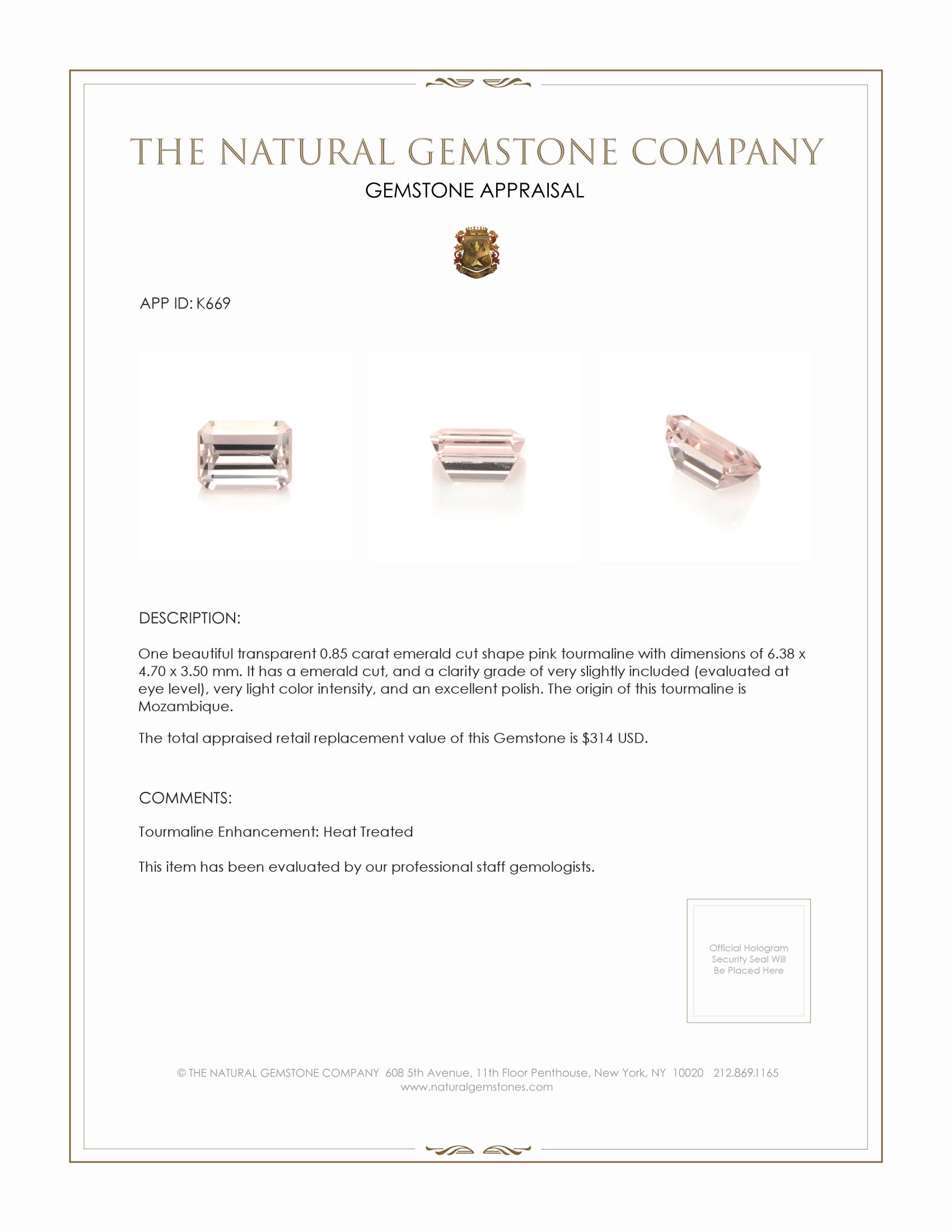 In a world where elegance is often fleeting, true luxury is found in masterpieces that transcend time. Enter a realm of sophisticated allure with The Natural Gemstone Company’s exquisite offering—a transparent 0.85 carat emerald cut pink tourmaline. This gem, with its perfect dimensions of 6.38 x 4.70 x 3.50 mm, is not merely a stone, but a legacy waiting to be born. Its radiant hue, a whisper of pink that lends a gentle, blushing allure, captivates the eye with its very light color intensity while the emerald cut creates an interplay of light and shadow, magnificently catching and refracting every glimmer that dances upon its surface.
