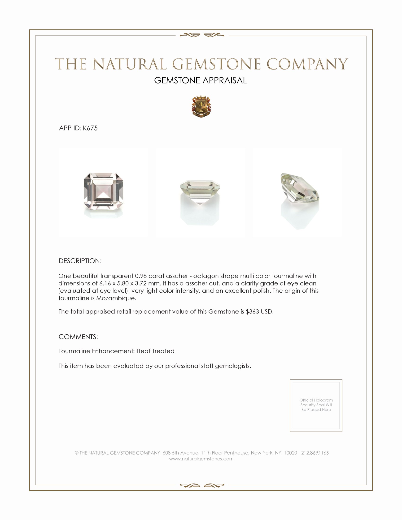 The exquisite 0.98 carat Asscher-cut multi-color tourmaline offered by The Natural Gemstone Company is a masterpiece of gemstone artistry, marrying both nature's brilliance and human craftsmanship into one breathtaking piece. With its precise dimensions of 6.16 x 5.80 x 3.72 mm, this gemstone showcases a delicate balance between size and symmetry. This Asscher-cut, often synonymous with the octagonal shape, is known for its step-like facets that create an endless hall-of-mirrors effect. This faceting style enriches the depth and character of the tourmaline, ensuring a spellbinding display of vibrant reflections from every possible angle.
