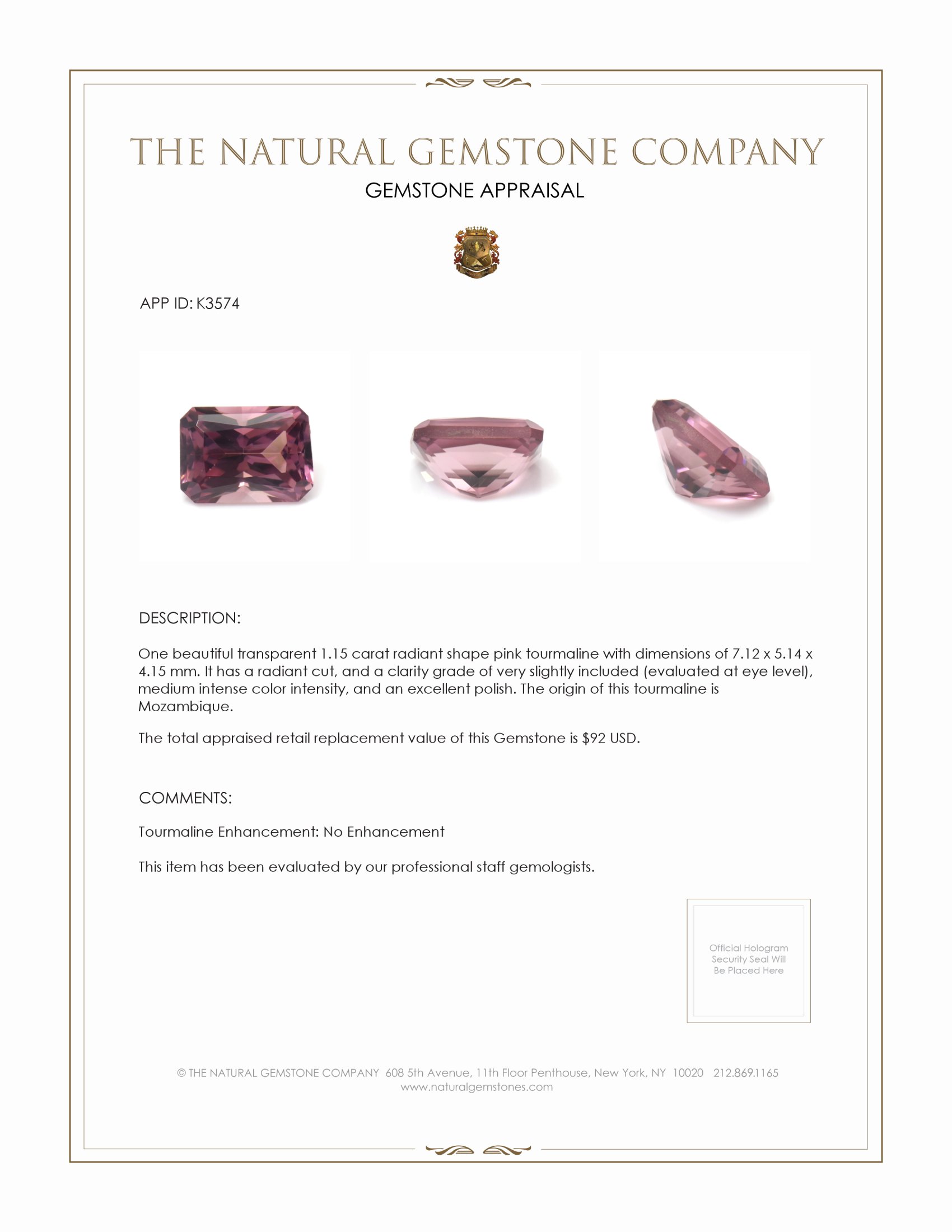 The Natural Gemstone Company is proud to present a stunning 1.15 carat pink tourmaline, showcasing the exceptional durability and exquisite craftsmanship that make it ideal for daily wear in fine jewelry. This translucent gem embodies elegance and resilience, perfectly suited to withstand the rigors of everyday life. Thanks to its superb hardness and stability, the pink tourmaline offers a compelling option for those seeking a gemstone that combines beauty with practicality.