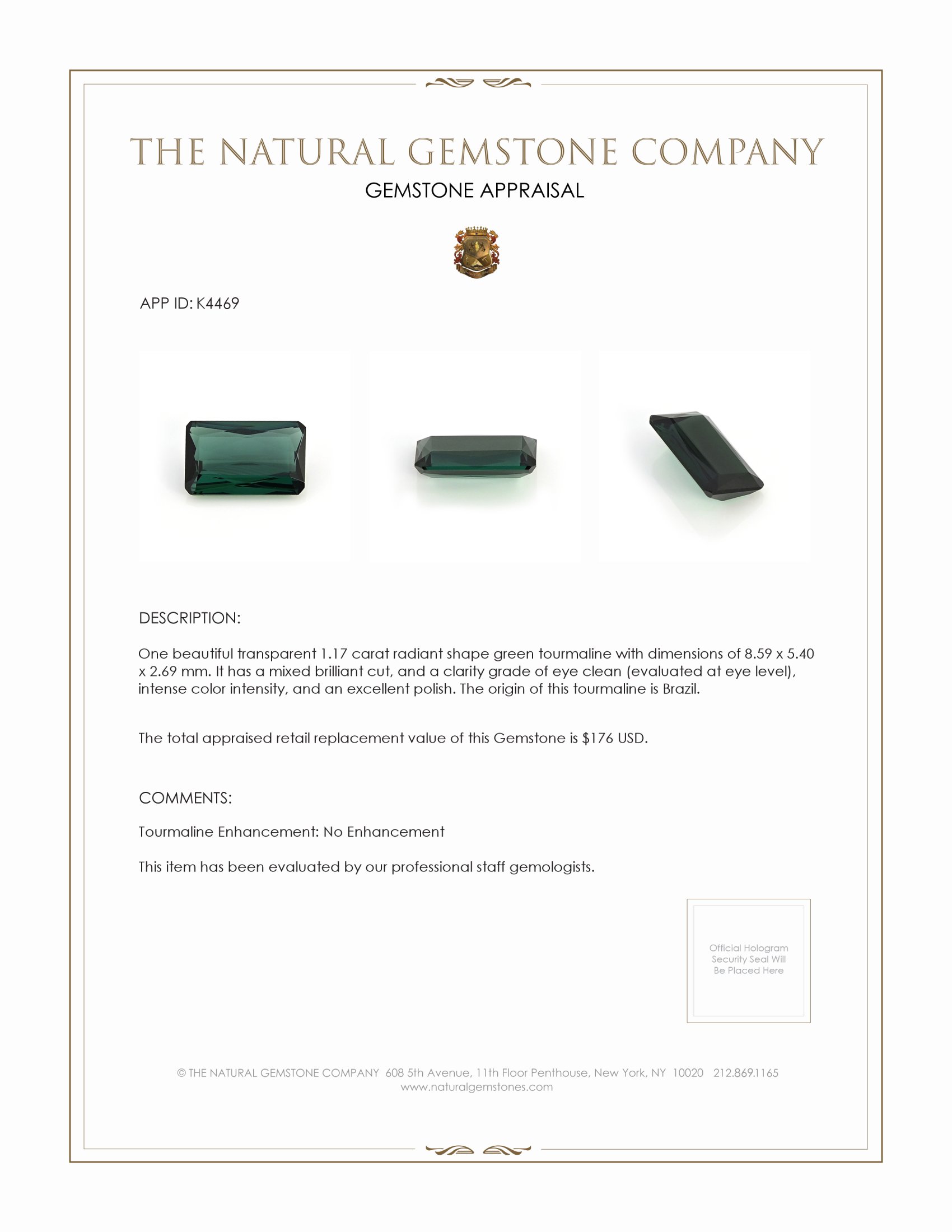 Discover the epitome of rarity with our exquisite 1.17 carat radiant shape green tourmaline. Handpicked for its exceptional quality and unique characteristics, this gemstone stands out in both size and color. The dimensions of 8.59 x 5.40 x 2.69 mm and the remarkable mix of a brilliant cut ensure a captivating sparkle that is rare in the gemstone world. With an eye clean clarity grade, its beauty is unhindered by any inclusions. This tourmaline’s intense color intensity is what sets it truly apart, offering a deep, rich green hue that commands attention and admiration.